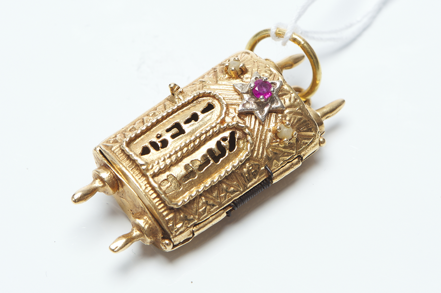 A TORAH CASE LOCKET IN 14CT GOLD SETE WITH A RUBY, LENGTH 45MM, 13.1GMS