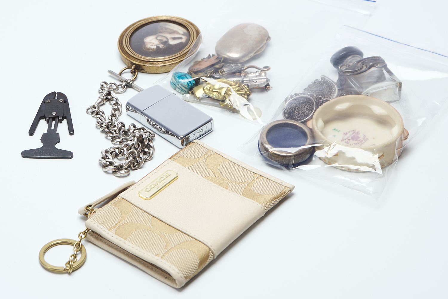 AN ECLECTIC COLLECTION OF ANTIQUE AND VINTAGE TRINKETS INCLUDING ART NOUVEAU ITEMS, FRENCH PERFUME BOTTLE, MINIATURE PAINTING, A BRITISH BUTTNER TOOL ETC..
