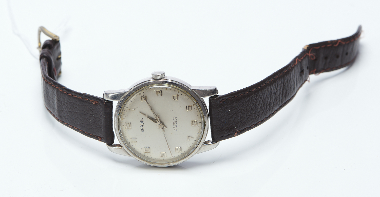 A 1950s GRADUS MANUAL WRISTWATCH IN STAINLESS STEEL, OFF WHITE DIAL WITH ARAB NUMERALS, DIAMETER 34MM, TO BROWN LEATHER BANDS