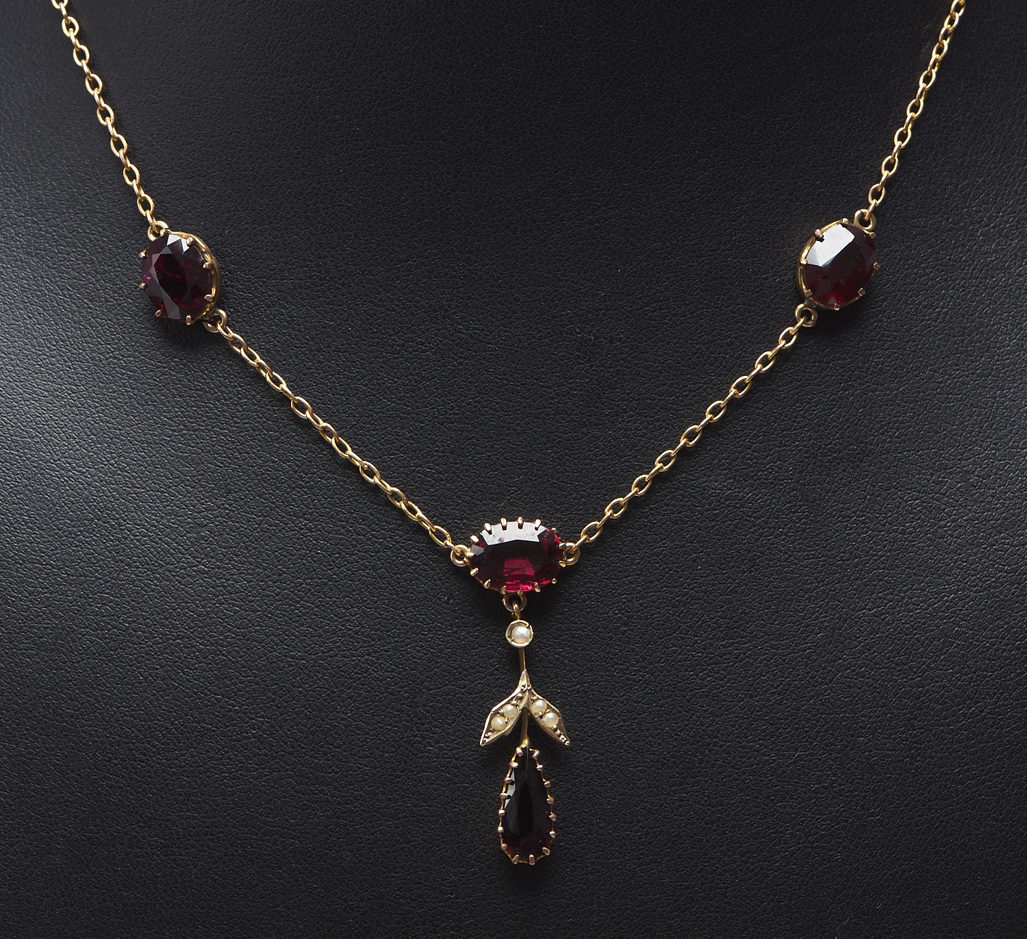 AN ANTIQUE GARNET AND SEED PEARL NECKLACE IN 9CT GOLD, TO A BOX CLASP, HALLMARKED, LENGTH 41CMS, 5.2GMS