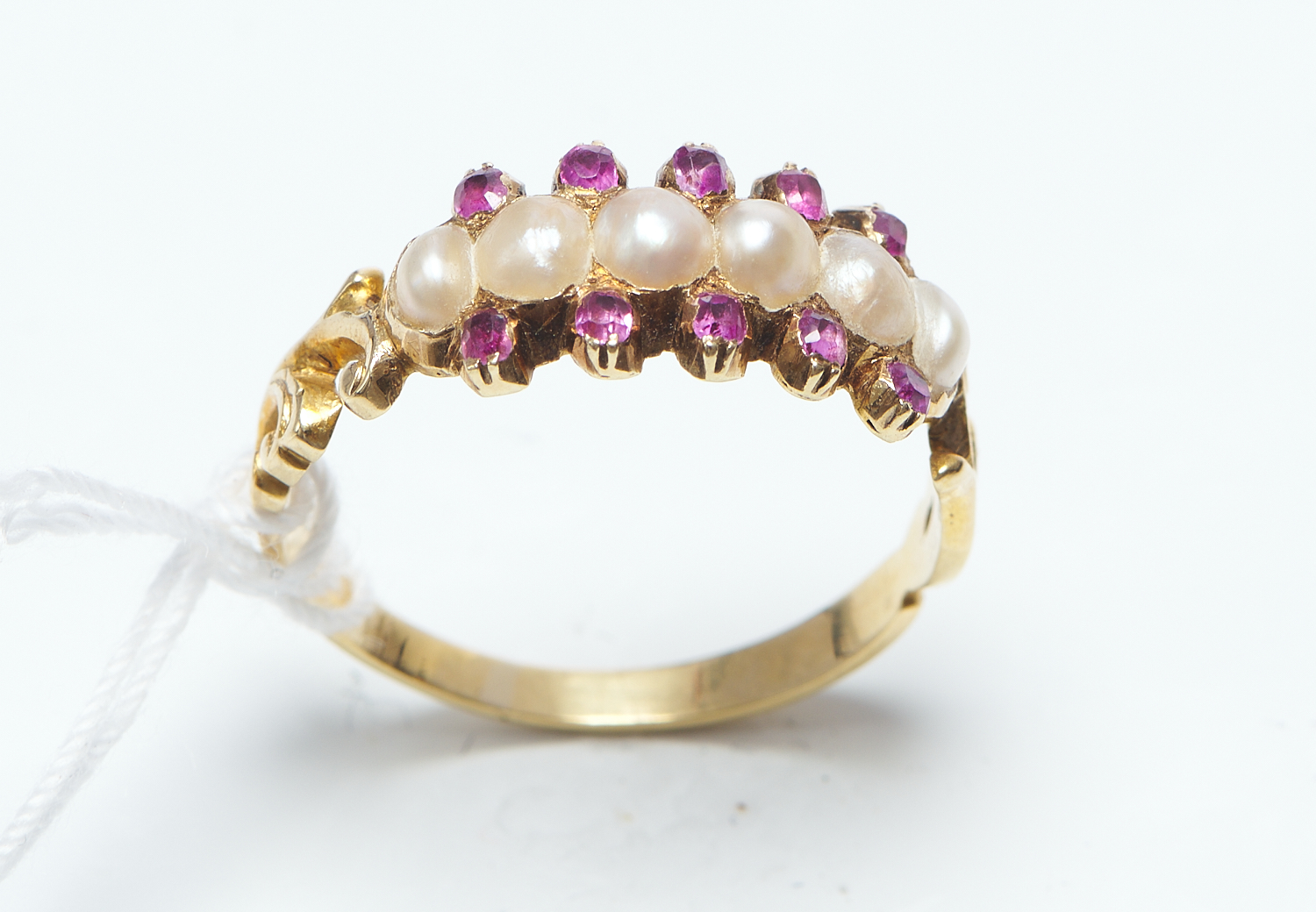 AN ANTIQUE RUBY AND SEED PEARL RING IN 15CT GOLD, SIZE N-O, 2.26GMS