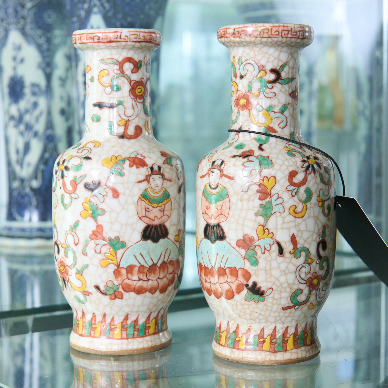 The rouleau-shaped vases covered in a thick white crackled glaze, with polychrome enamel decoration of seated figures on lotus thrones surrounded by scrolling flowers.