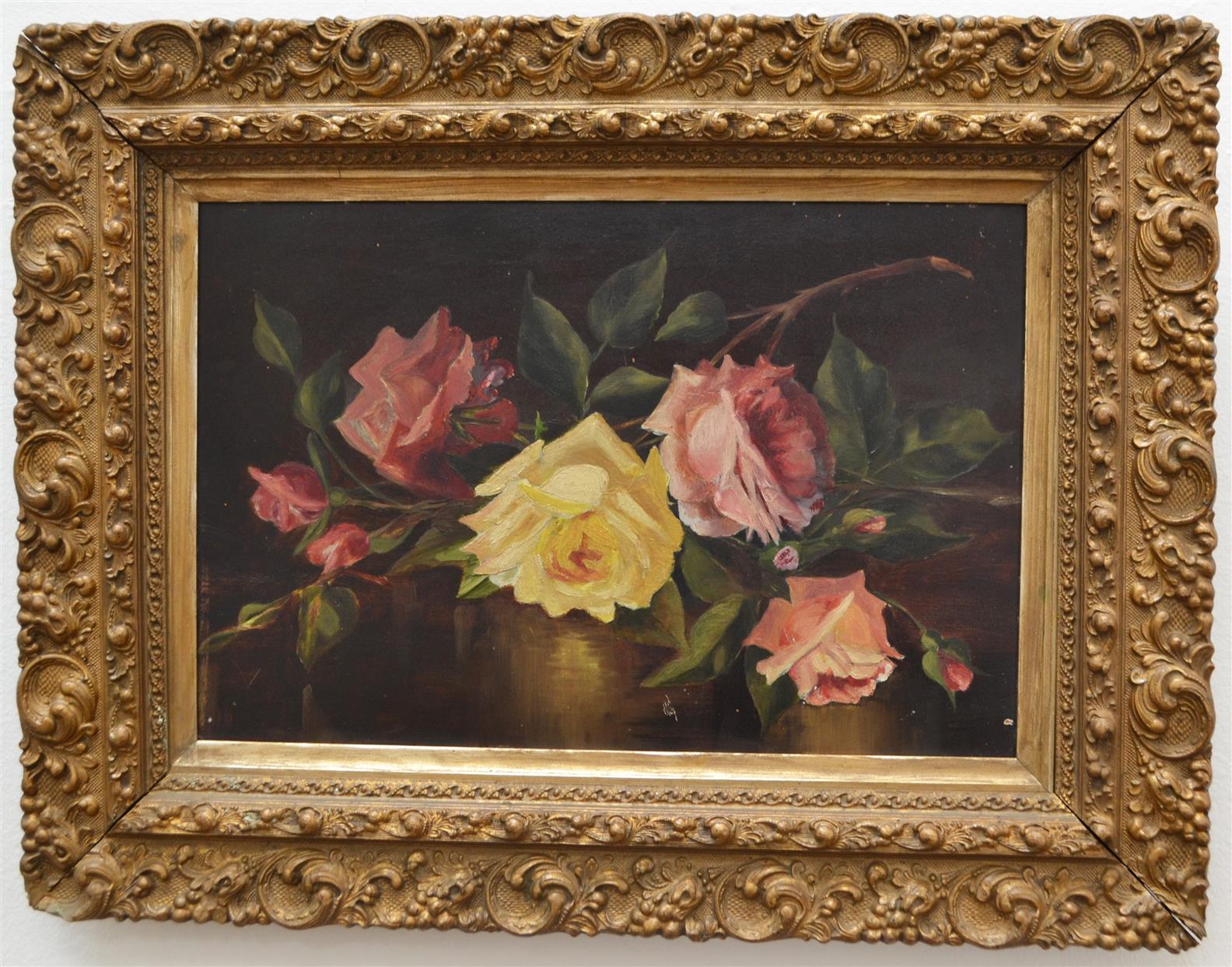 ARTIST UNKNOWN, ROSES, OIL ON BOARD, 31 X 47CM, FRAME: 48 X 64CM, CONDITION: DISCOLOURATION, SCRATCHES AND LIGHT CRACKING, LEONARD JOEL DELIVERY SIZE: SMALL
