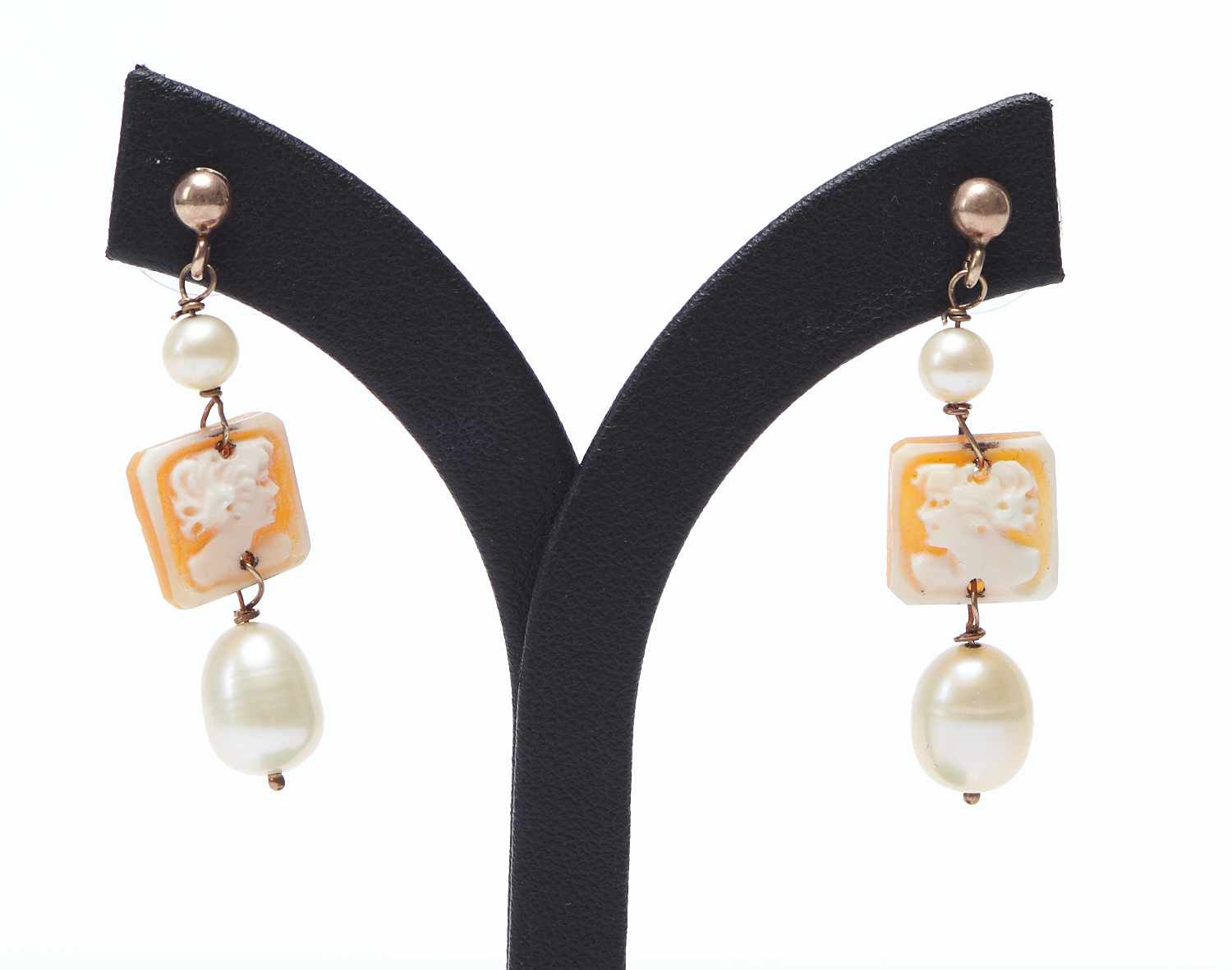 A PAIR OF SHELL CAMEO AND CULTURED PEARL EARRINGS IN GILT, TO POST FITTINGS, LENGTH 4CMS