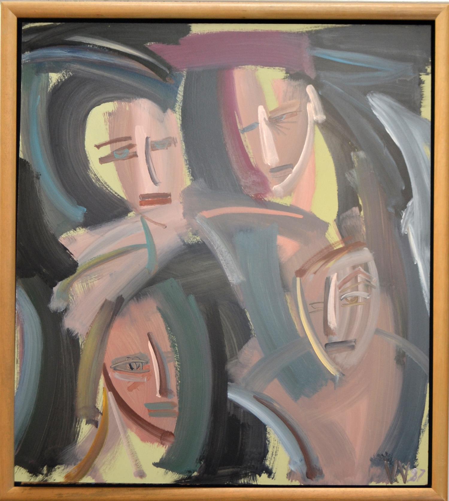 VICKI VARVARESSOS, FOUR HEADS 1987, OIL ON BOARD, 122 X 107CM, FRAME SIZE: 132 X 117CM, CONDITION: BOARD IS COMING LOOSE FROM THE FRAME IN LOWER LEFT CORNER, OTHERWISE VERY GOOD, LEONARD JOEL DELIVERY SIZE: LARGE