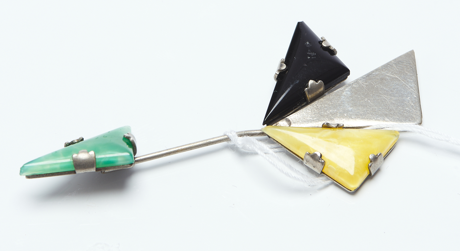 AN ART DECO PIN IN SILVER FEATURING COLOURED BAKELITE DETAILS, MARKED FNCO, LENGTH 65MM