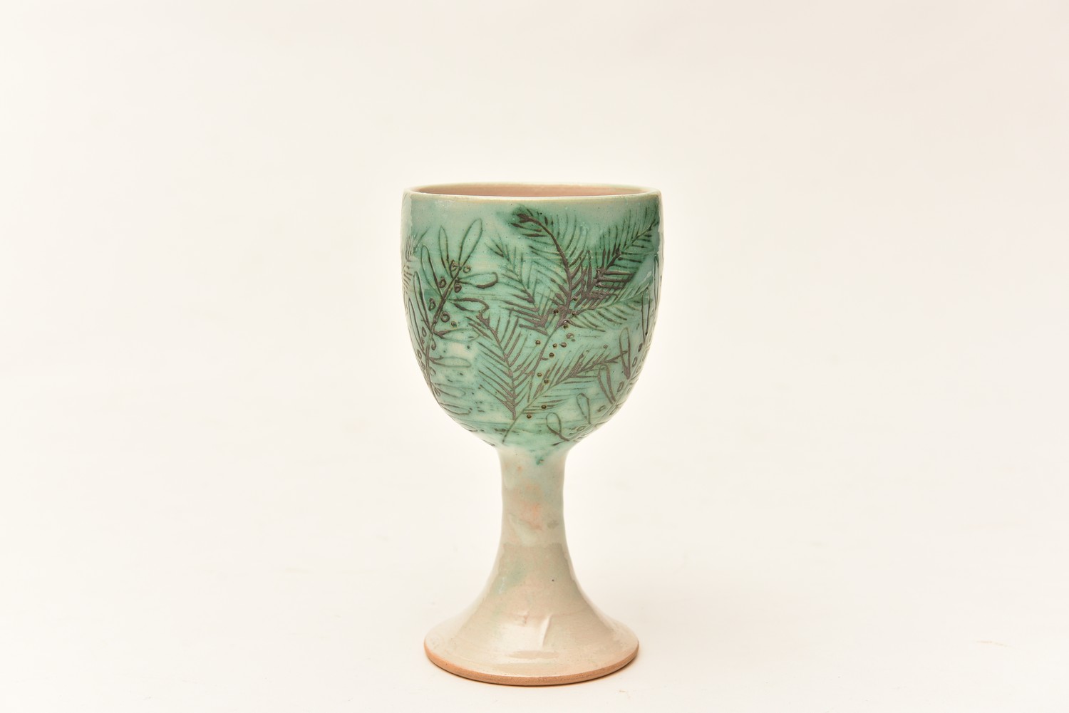 A MIRKA MORA DECORATED LARGE GOBLET THROWN AND SIGNED BY CHRIS SANDERS, '70, 16 CM H, LEONARD JOEL LOCAL DELIVERY SIZE: SMALL