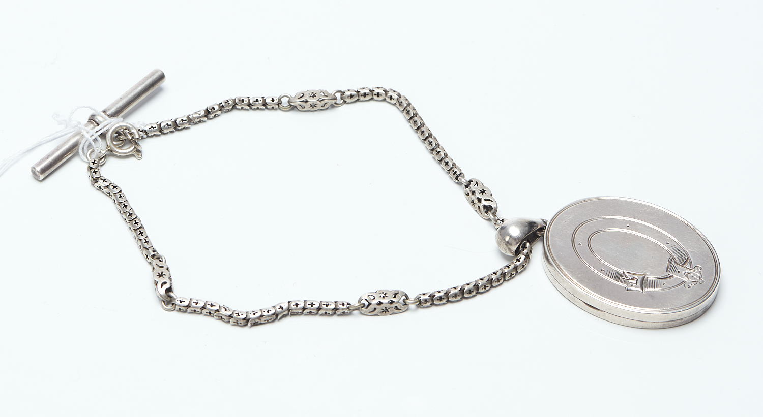 A VICTORIAN ENGRAVED LOCKET TO A FANCY LINK FOB CHAIN, LENGTH 27CMS