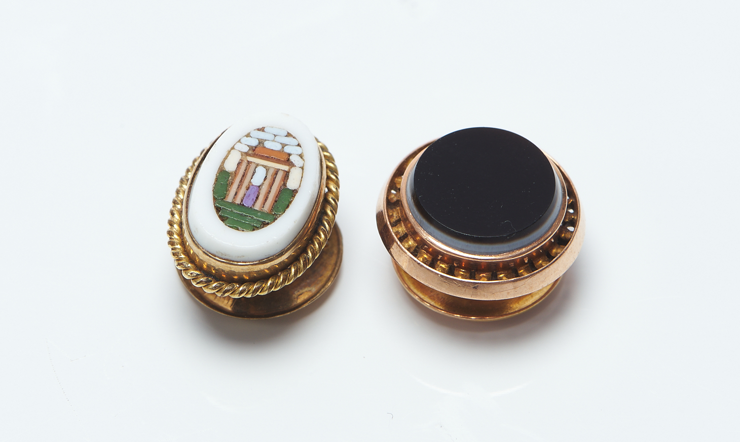TWO SHIRT STUDS TESTED IN 9CT GOLD, ONE FEATURING A MICRO-MOSAIC