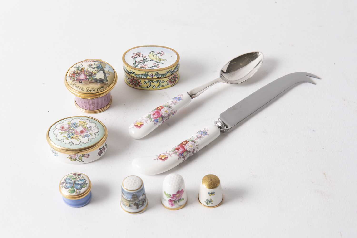 A GROUP OF ENAMEL ITEMS INCLUDING THIMBLES, TRINKET BOXES, ROYAL CROWN DERBY CHEESE KNIFE AND FORK, LEONARD JOEL LOCAL DELIVERY SIZE: SMALL