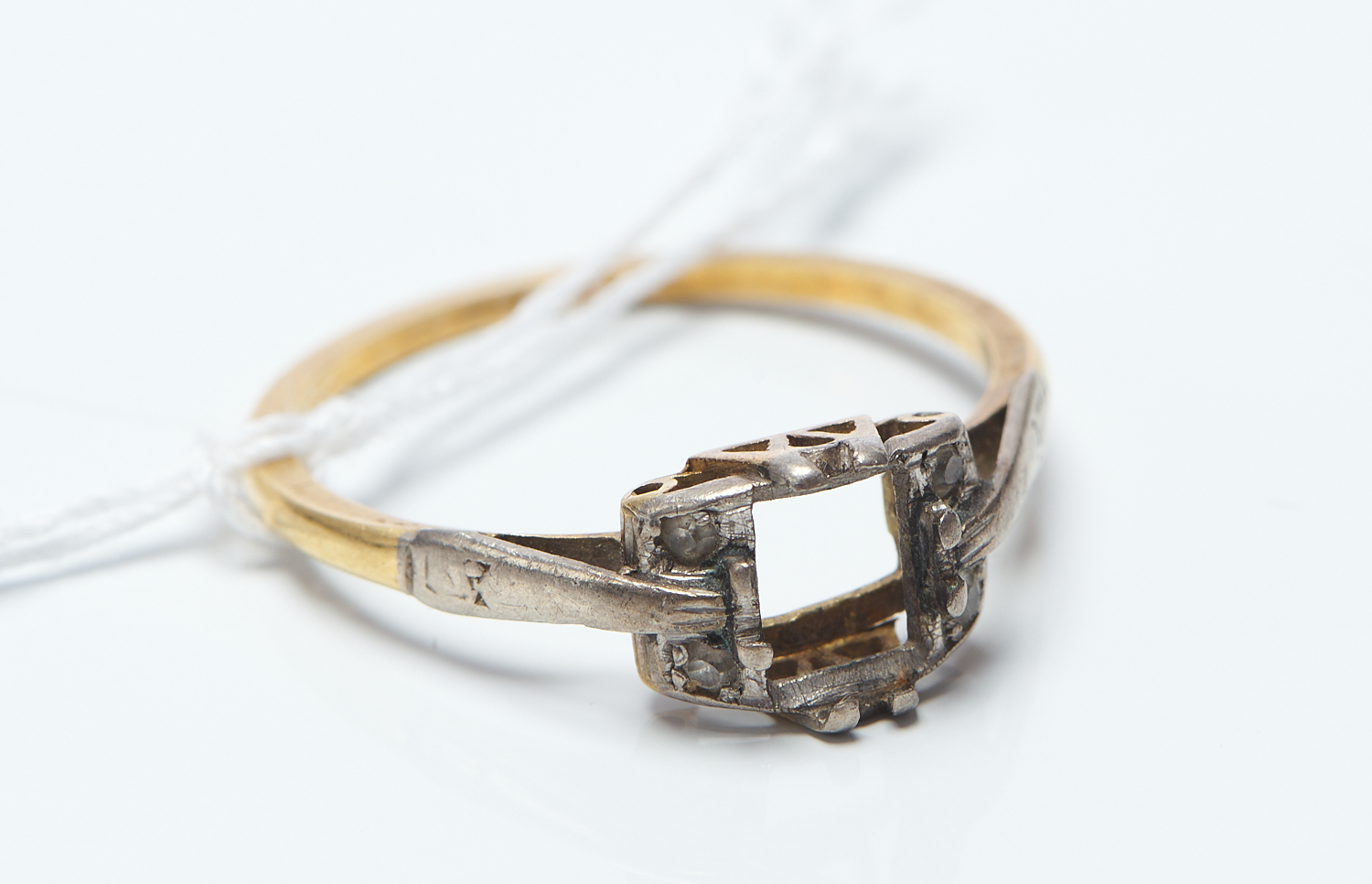 A RING SHANK WITH COLOURLESS STONES, CENTRE STONE DEFICIENT, IN TWO TONE 18CT GOLD, SIZE P-Q, 2.2GMS