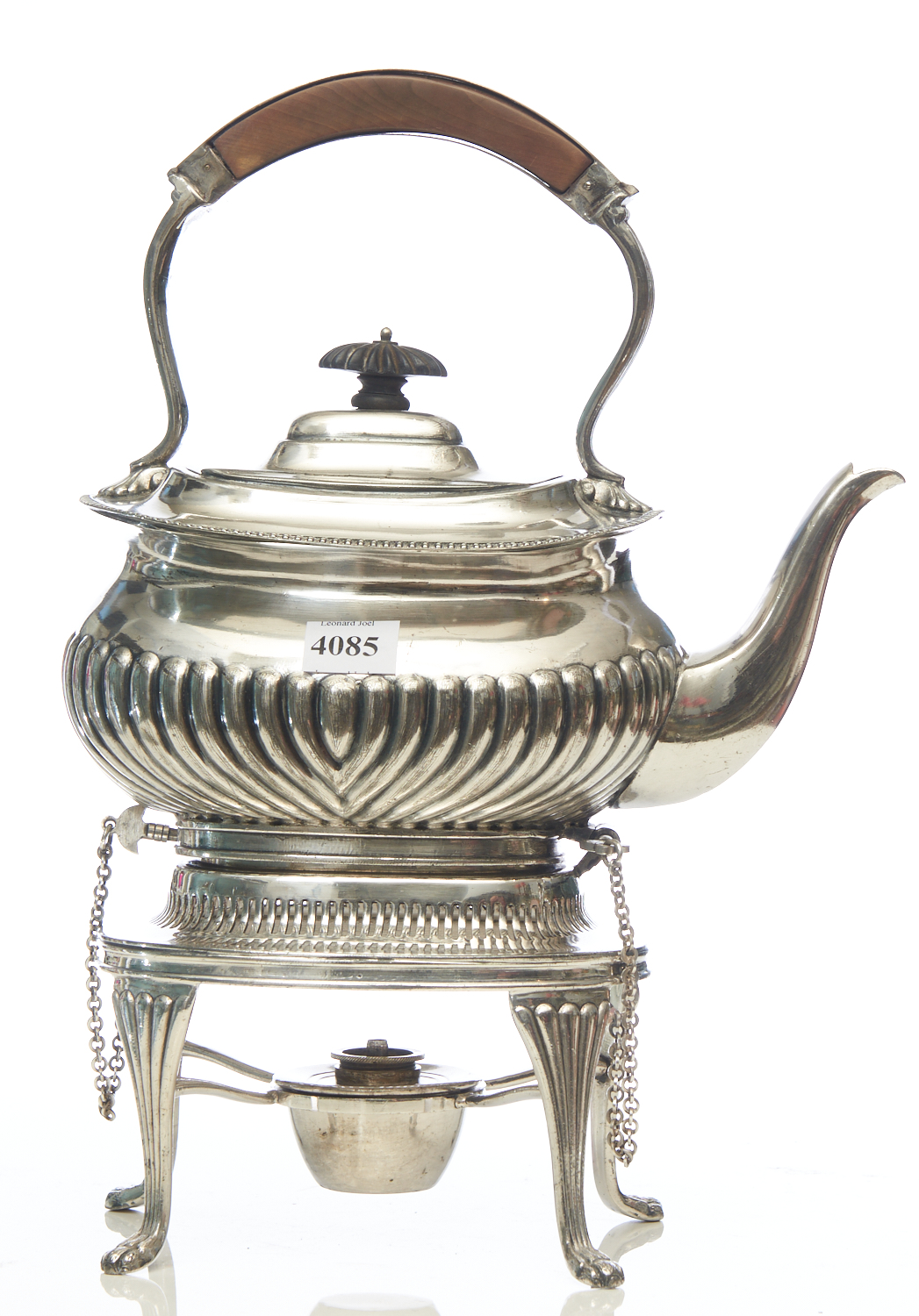 A VICTORIAN SILVERPLATE SPIRIT KETTLE ON STAND WITH ORIGINAL BURNER, LEONARD JOEL LOCAL DELIVERY SIZE: SMALL