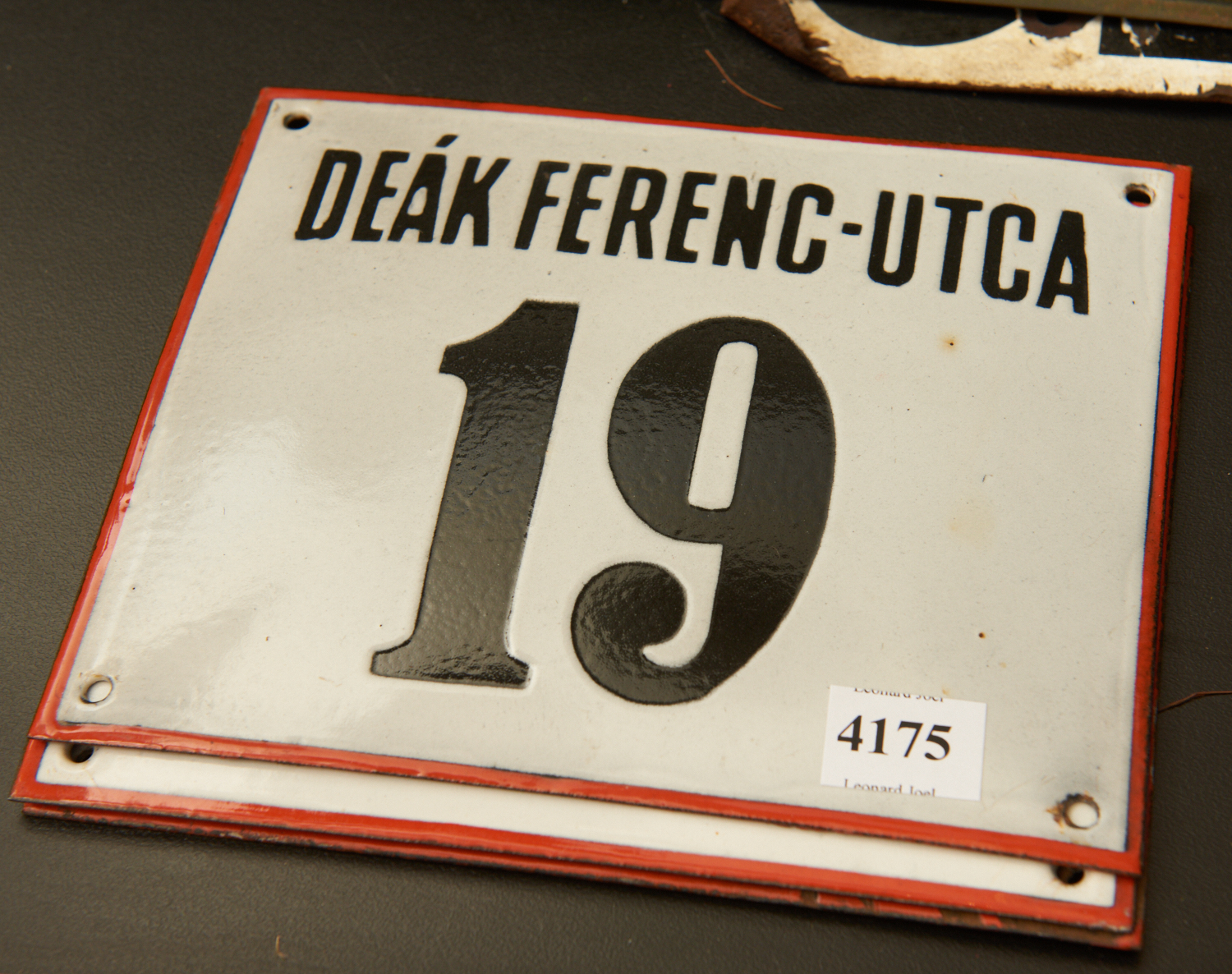 A GROUP OF THREE HUNGARIAN ENAMEL STREET SIGNS, LEONARD JOEL LOCAL DELIVERY SIZE: SMALL