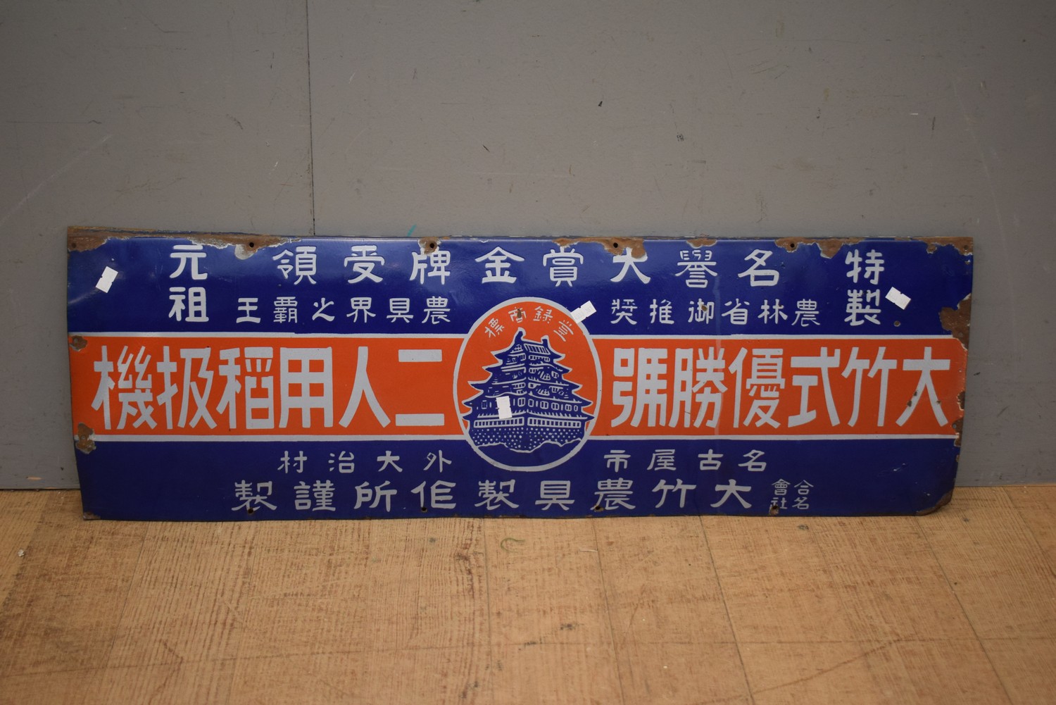 A JAPANESE RED BLUE AND WHITE ENAMEL SIGN WITH TEMPLE IMAGE TO CENTRE (29H x 85W CM) (LEONARD JOEL DELIVERY SIZE: MEDIUM)