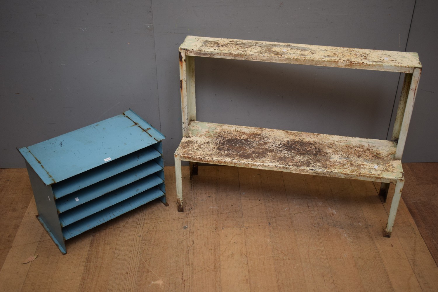2 PIECES - WHITE INDUSTRIAL METAL TWO TIER STAND AND AQUA PAINTED INDUSTRIAL METAL FILING SHELVES (SHELF 72H x 92W x 29D CM) (LEONARD JOEL DELIVERY SIZE: MEDIUM)