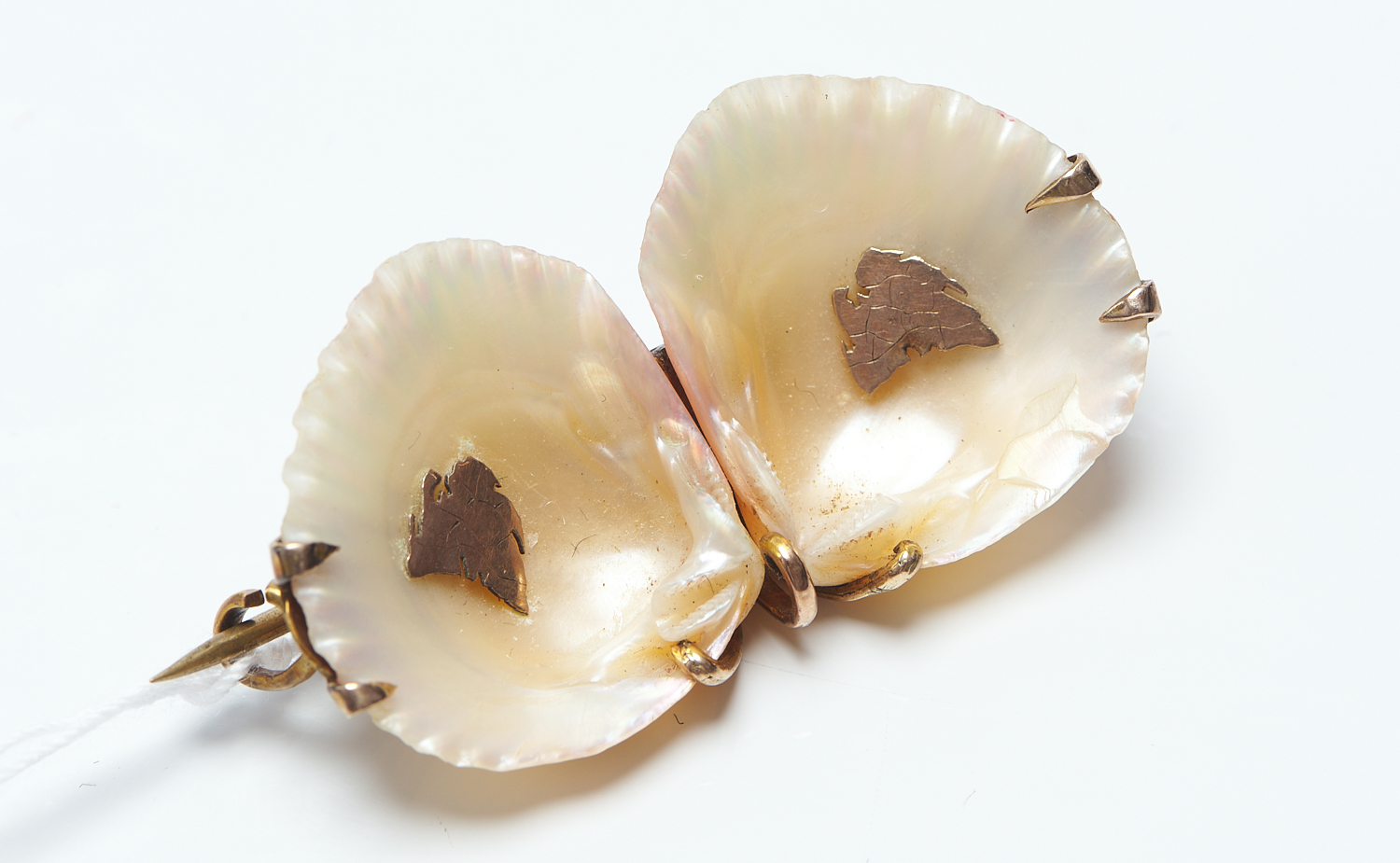 AN ANTIQUE BROOCH BY TAYLOR & SHARP (HOBART), IN 9CT GOLD COMPRISING SHELLS AND GOLD DETAILS, LENGTH 40MM
