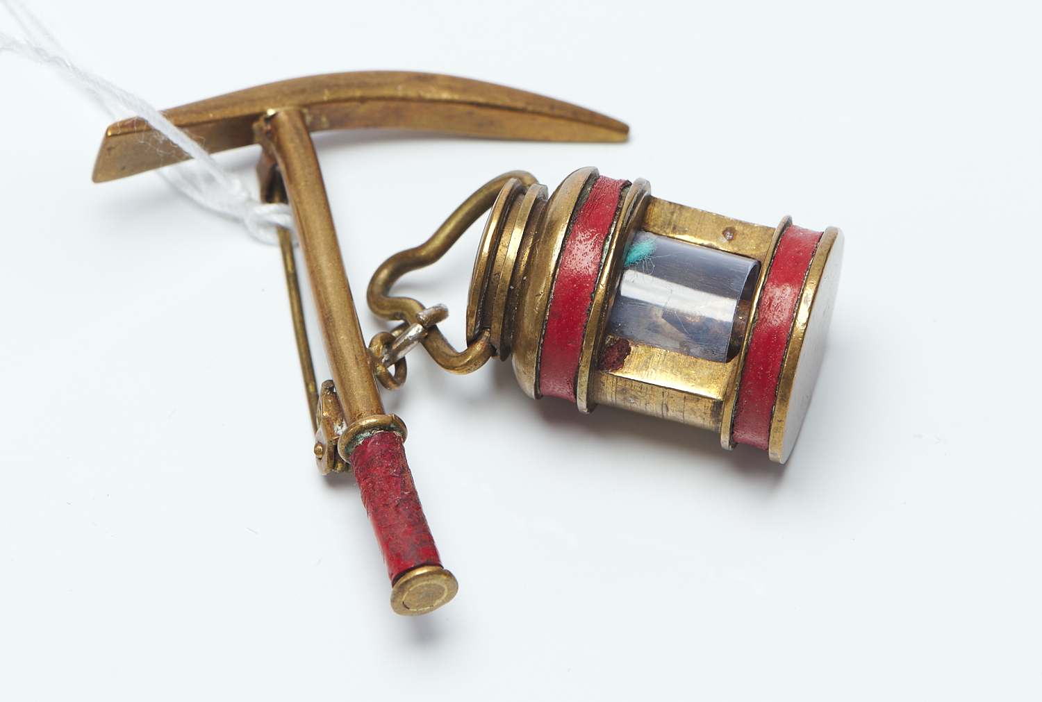 AN UNUSUAL COAL MINING PICK AND LANTERN BROOCH IN BRASS WITH RED ENAMEL, A/F