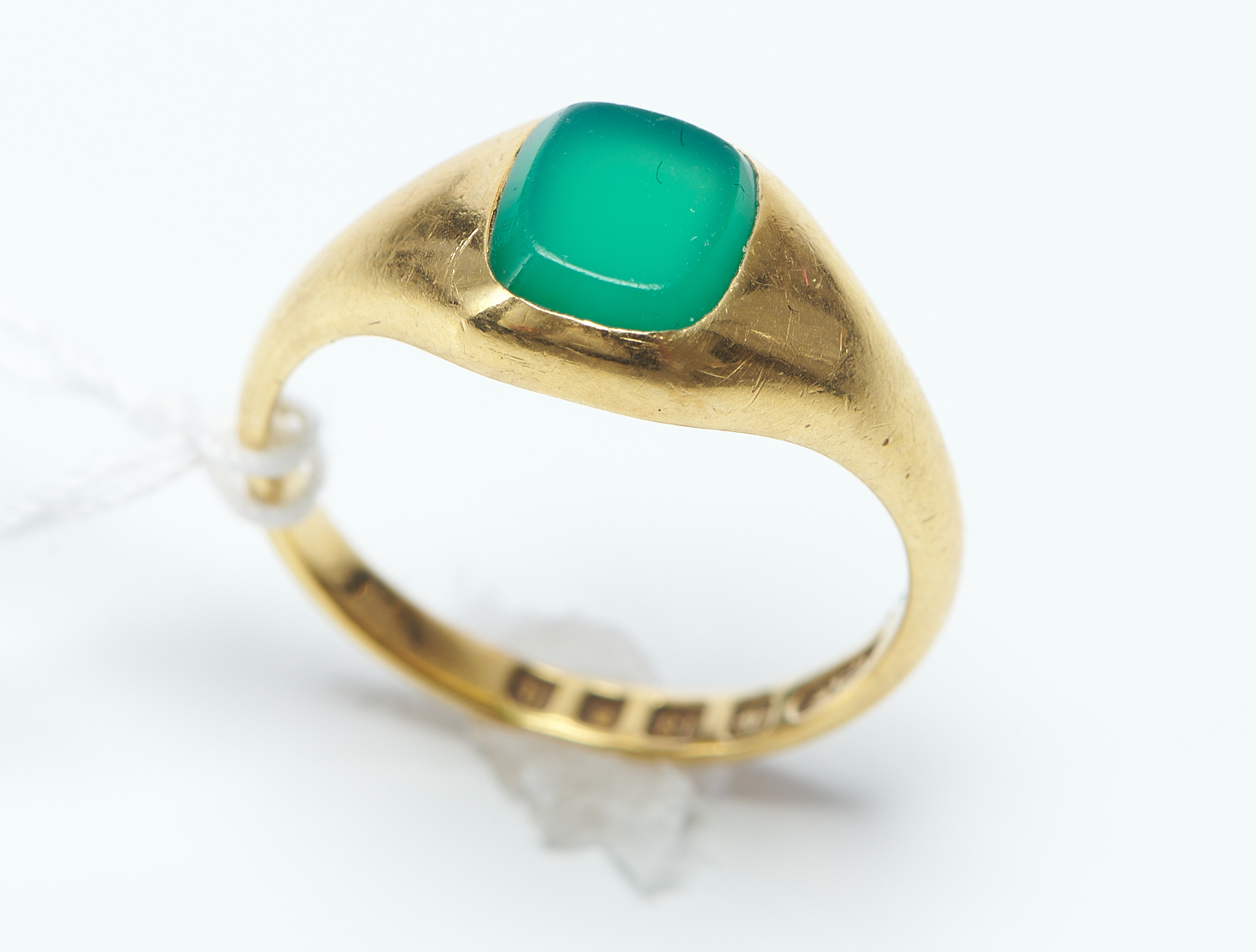 A CHRYSOPRASE SIGNET RING IN 18CT GOLD, HALLMARKED LONDON, MAKER C.G & S, SIZE K, 3.6GMS