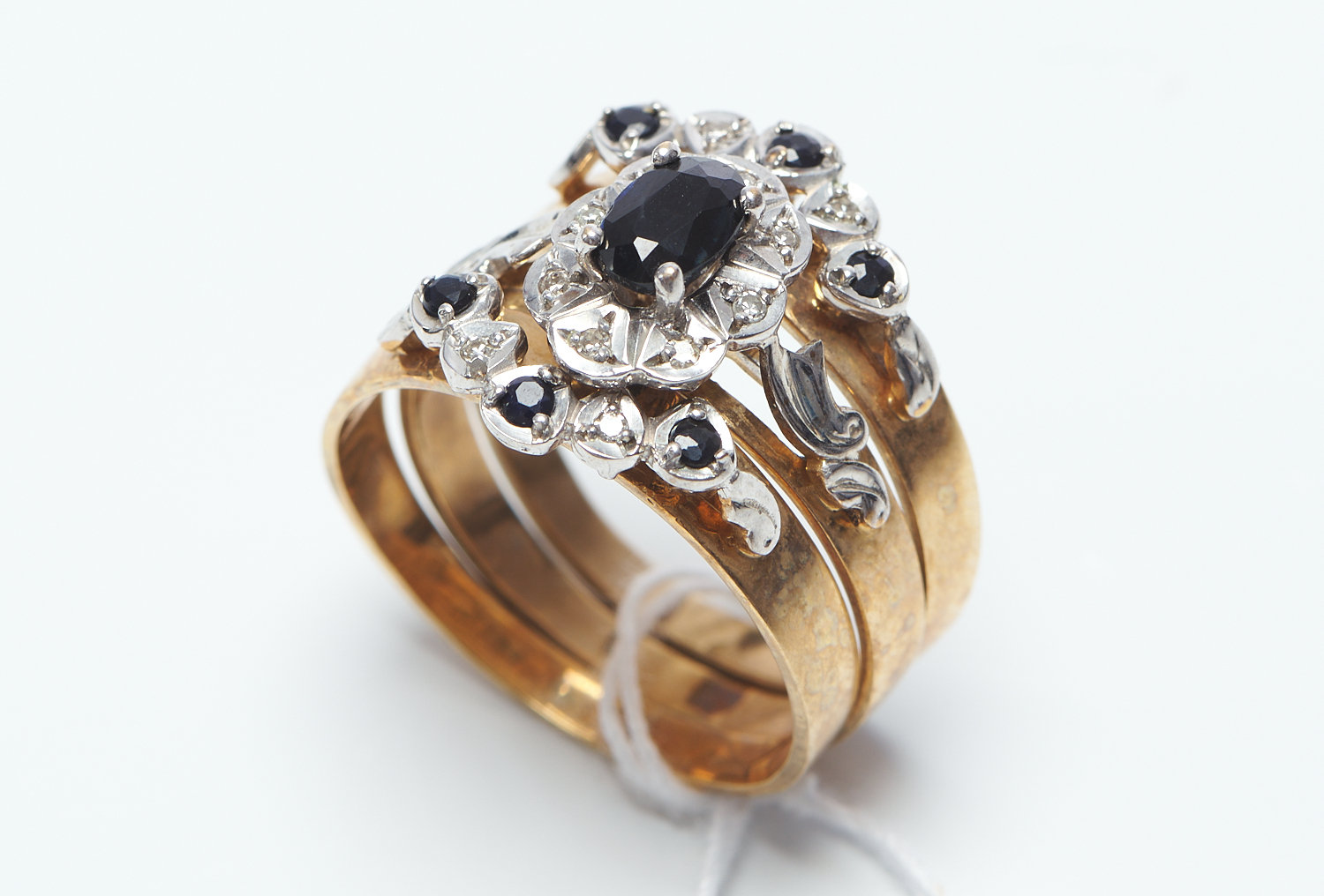 A SAPPHIRE AND DIAMOND RING SUITE IN 9CT GOLD, SIZE Q, 7GMS