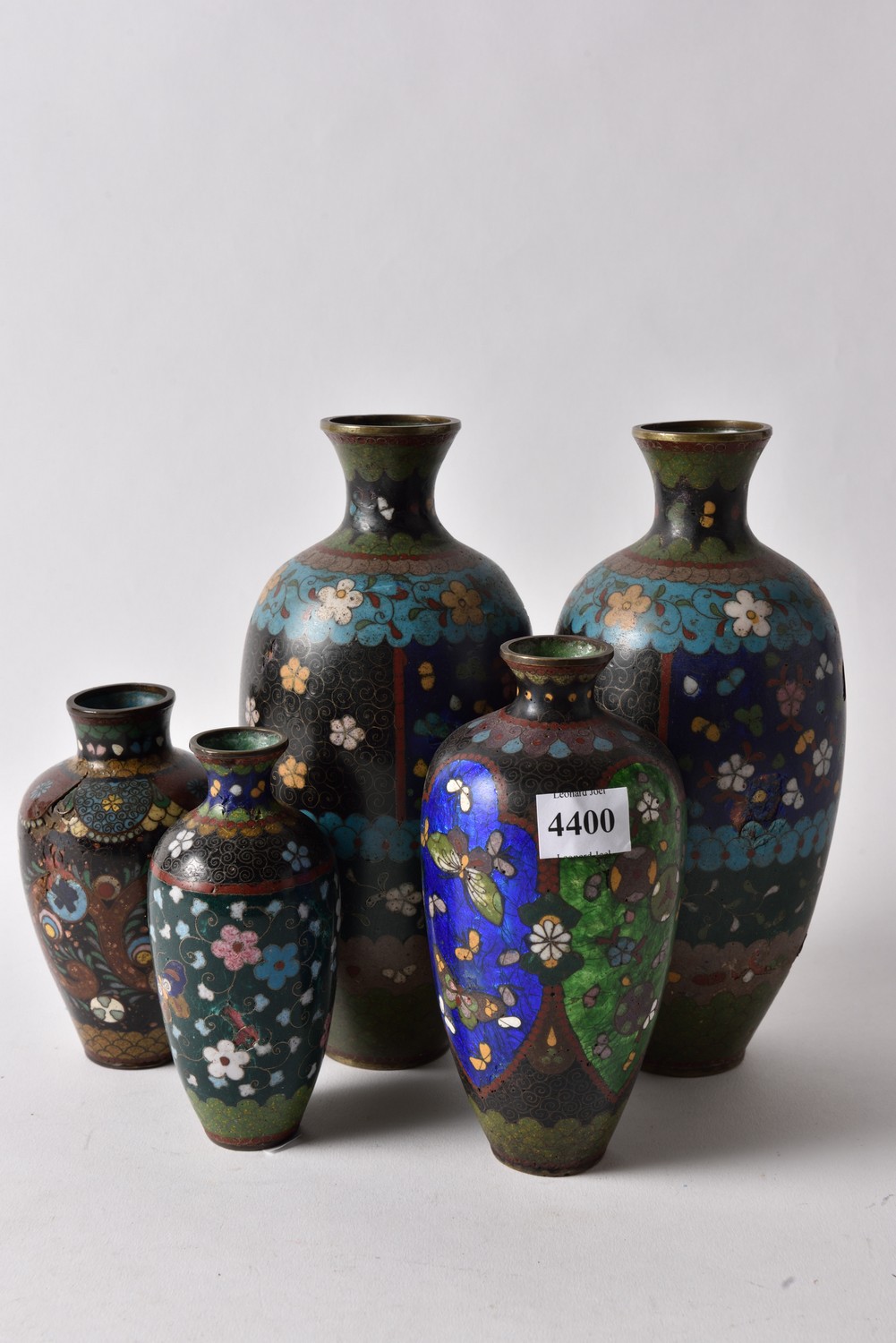 A COLLECTION OF FIVE JAPANESE CLOISONNE VASES (A/F), THE TALLEST 20.5 CM H, MEIJI PERIOD, LEONARD JOEL LOCAL DELIVERY SIZE: SMALL