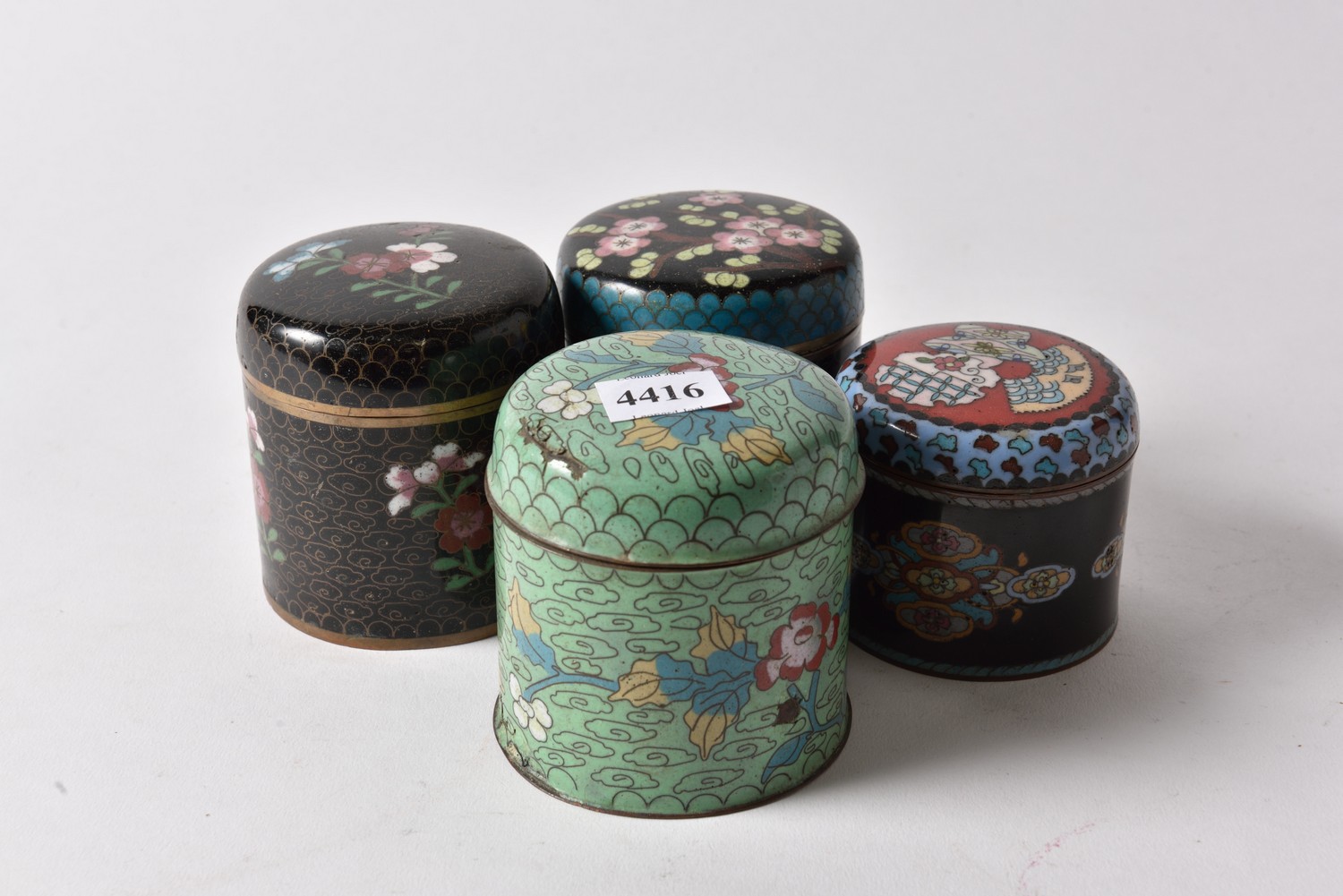 FOUR JAPANESE CYLINDRICAL CLOISONNE BOXES (8.3 CM H), LEONARD JOEL LOCAL DELIVERY SIZE: SMALL