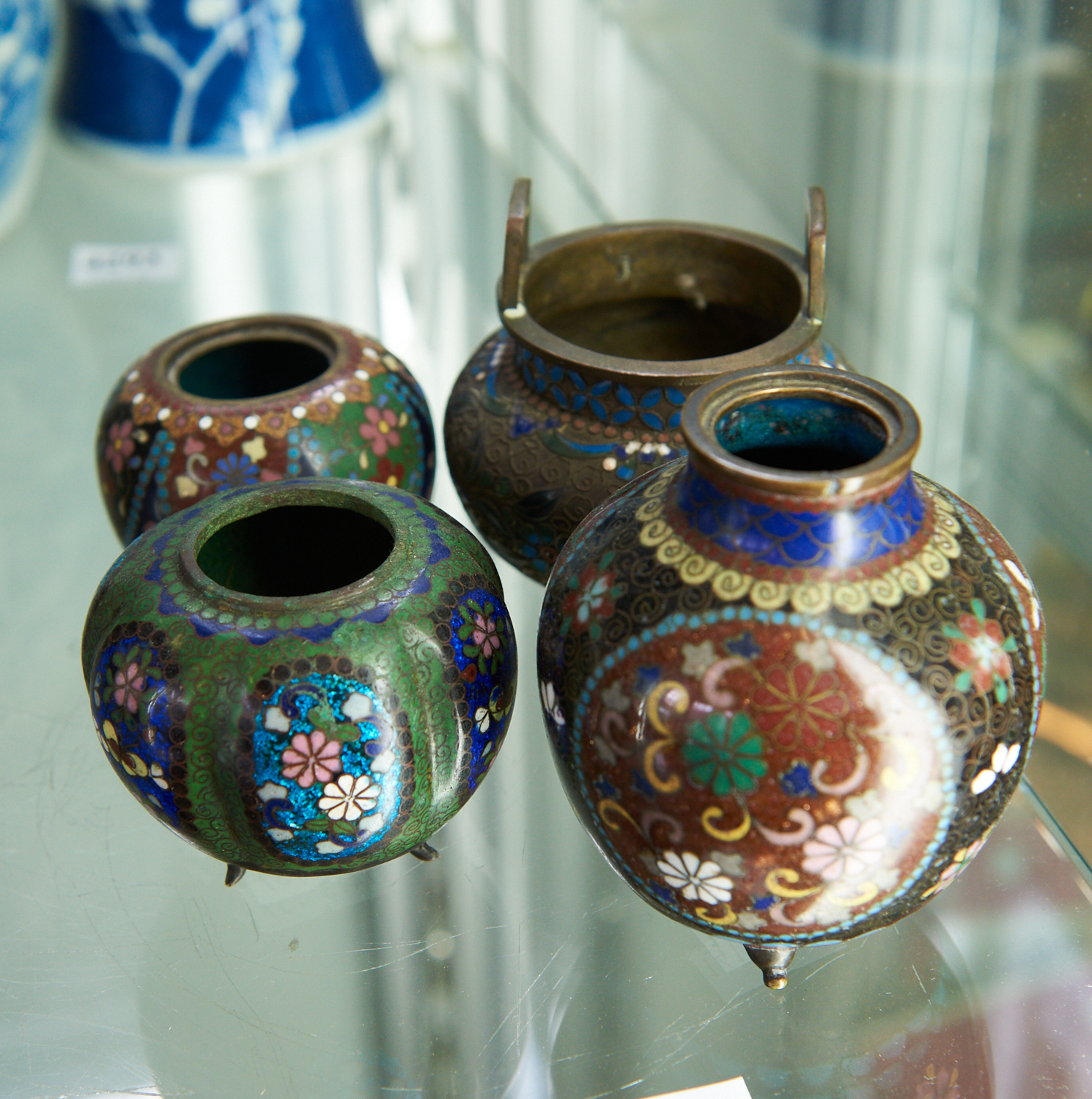 FOUR CLOISONNE VESSEL INCLUDING CENSER, KOROS (MISSING LIDS) NAD VASE, LEONARD JOEL LOCAL DELIVERY SIZE: SMALL