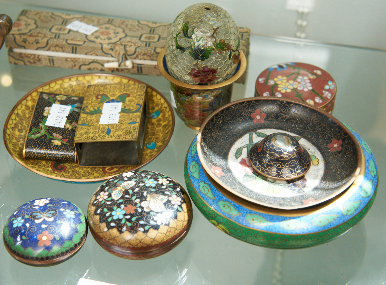 A COLLECTION OF SMALL CLOISONNE ITEMS INCL. DISHES, BOXES AND PLIQUE A JOUR EGG, LEONARD JOEL LOCAL DELIVERY SIZE: SMALL