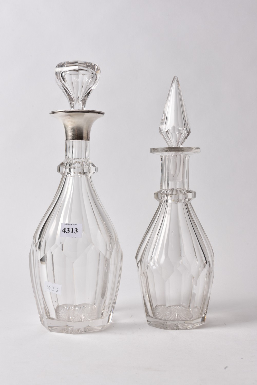 TWO CRYSTAL DECANTERS, ONE WITH A STERLING SILVER COLLAR, THE TALLEST 32.5 CM H, LEONARD JOEL LOCAL DELIVERY SIZE: SMALL
