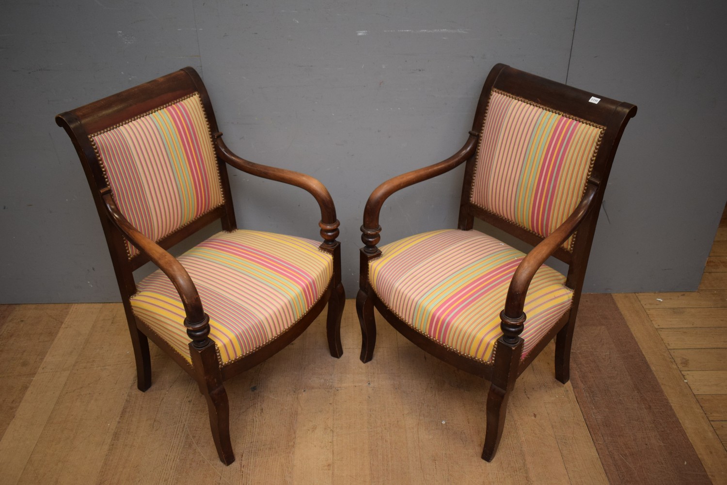 PAIR OF RESTORATION PERIOD MAHOGANY FAUTEUILS C,1810 (91H x 59W x 54D CM) (LEONARD JOEL DELIVERY SIZE: LARGE)