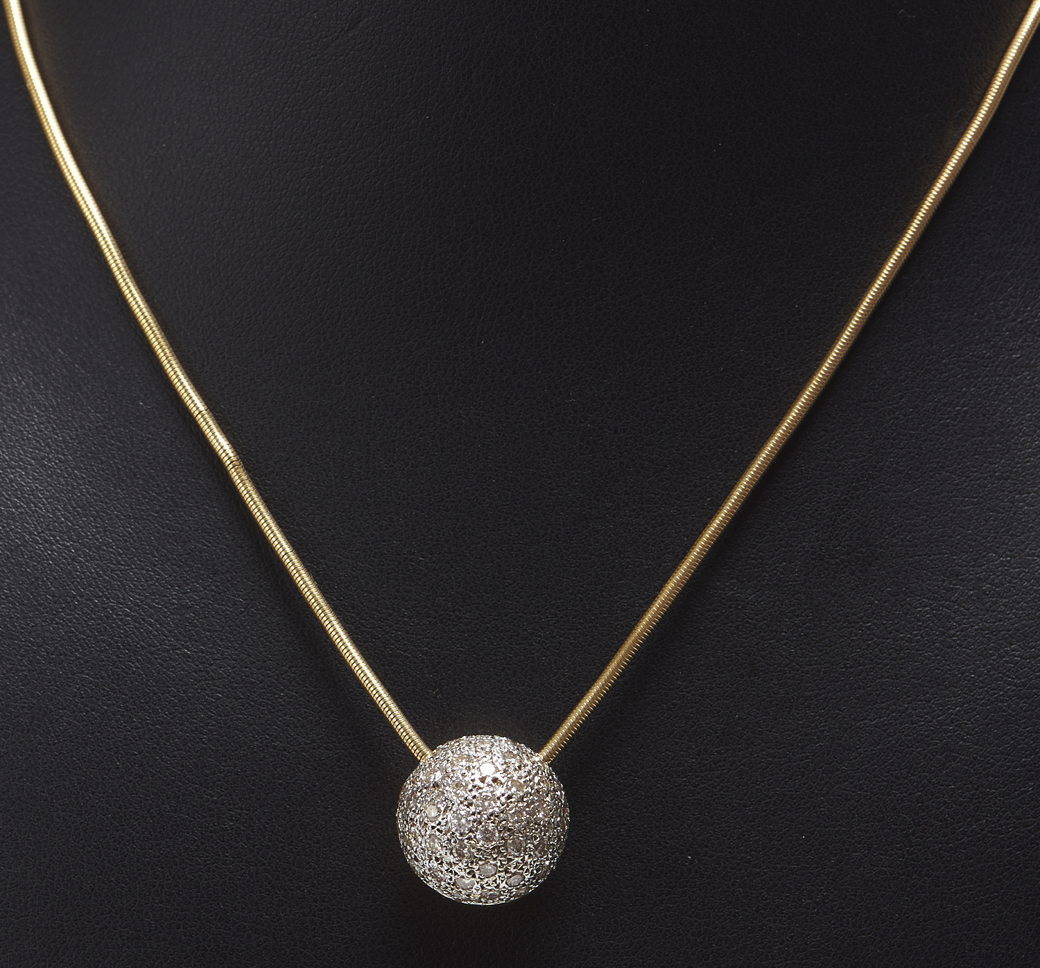 A PAVÉ SET DIAMOND BALL PENDANT IN 18CT GOLD, DIAMETER 15.8MM, TO AN OMEGA CHAIN IN 9CT GOLD, 15.4GMS