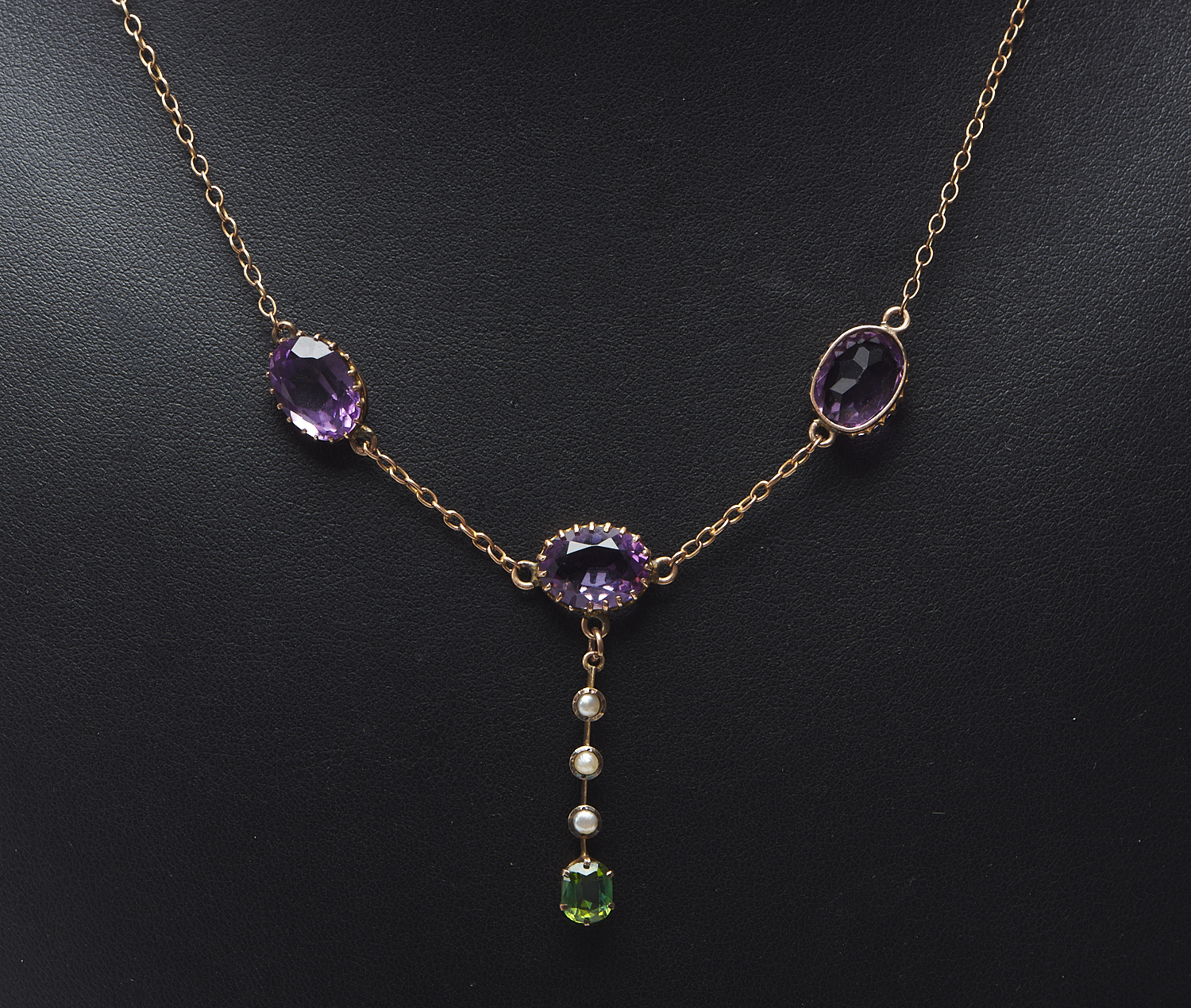 AN ANTIQUE AMETHYST, PEARL AND TOURMALINE NECKLACE NECKLACE IN 9CT GOLD, TOTAL LENGTH 560MM, 5.2GMS