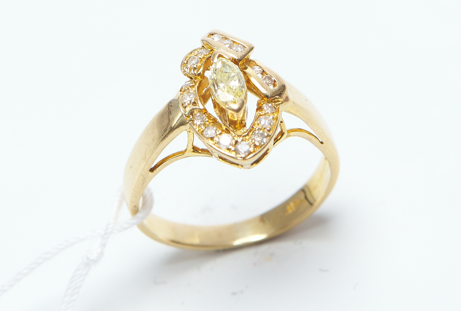 A YELLOW DIAMOND AND DIAMOND RING IN 18CT GOLD, FEATURING A MARQUISE CUT YELLOW DIAMOND OF 0.24CT, WITH DIAMOND SURROUND, SIZE K, 3GMS