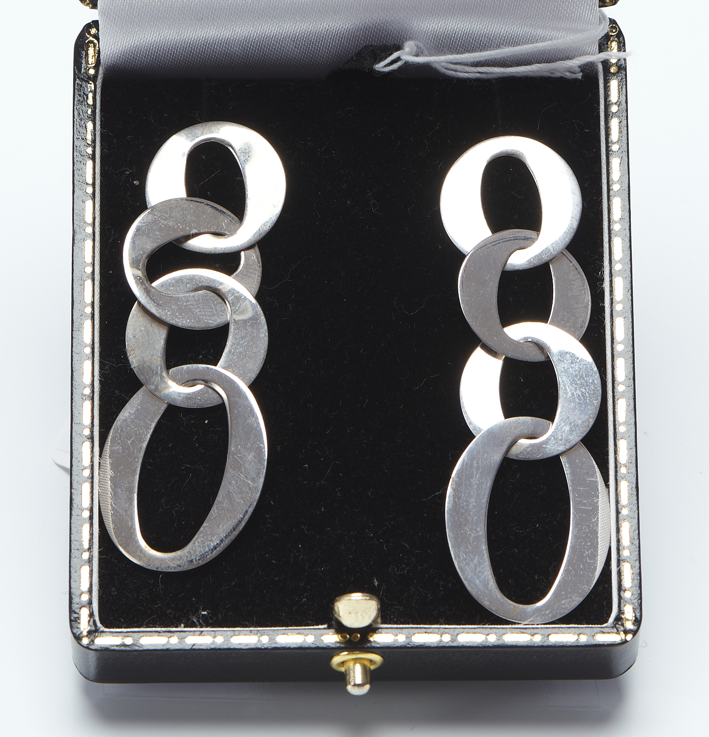 A PAIR OF MODERNIST DROP EARRINGS IN SILVER, LENGTH 60MM, BOXED