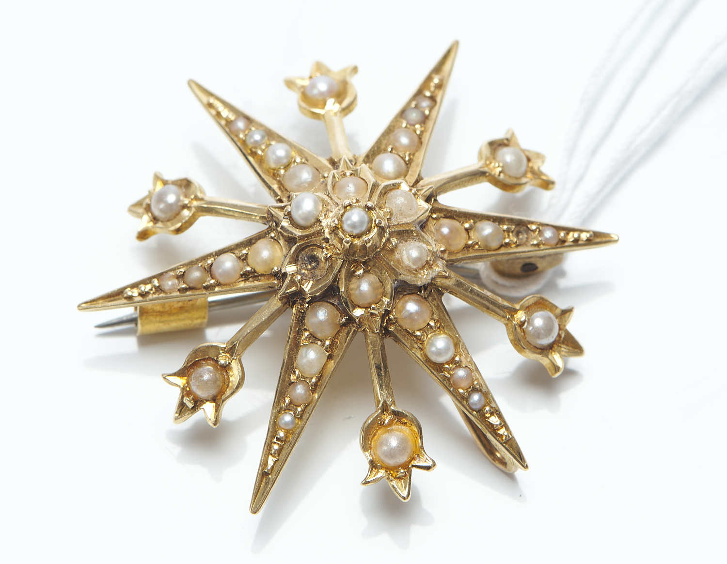 AN ANTIQUE AUSTRALIAN PEARL STARBURST BROOCH/PENDANT IN 15CT GOLD, BY J.N.DUMBRELL, HALLMARKED, A/F