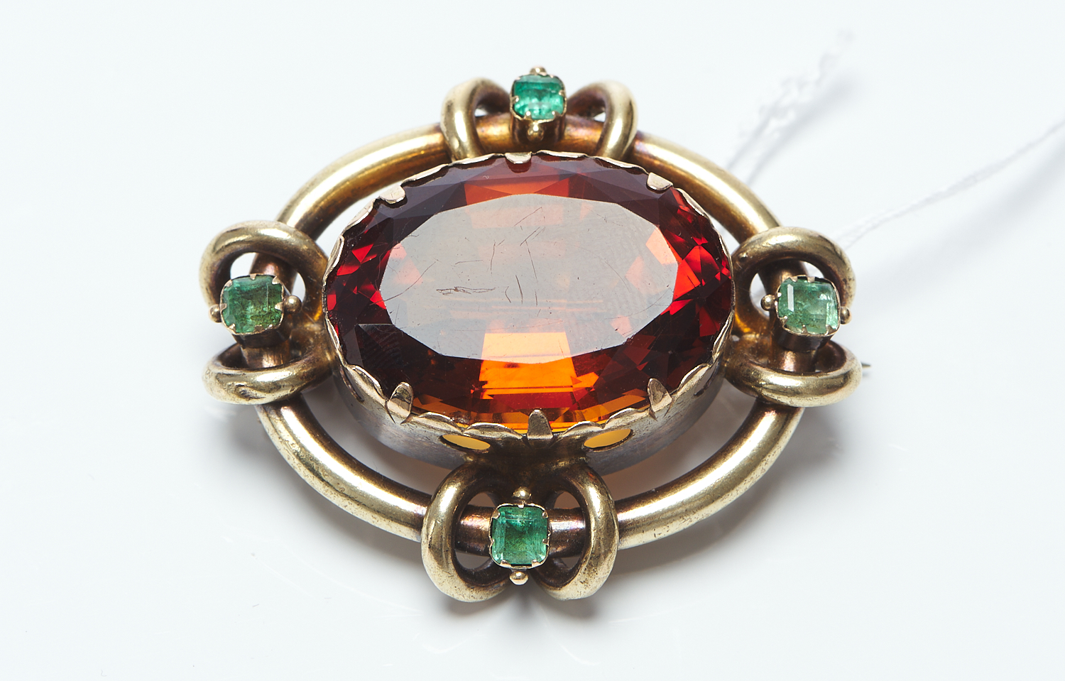 AN ANTIQUE CITRINE AND EMERALD BROOCH/PENDANT IN 9CT GOLD, 50X40MM, 16.2GMS