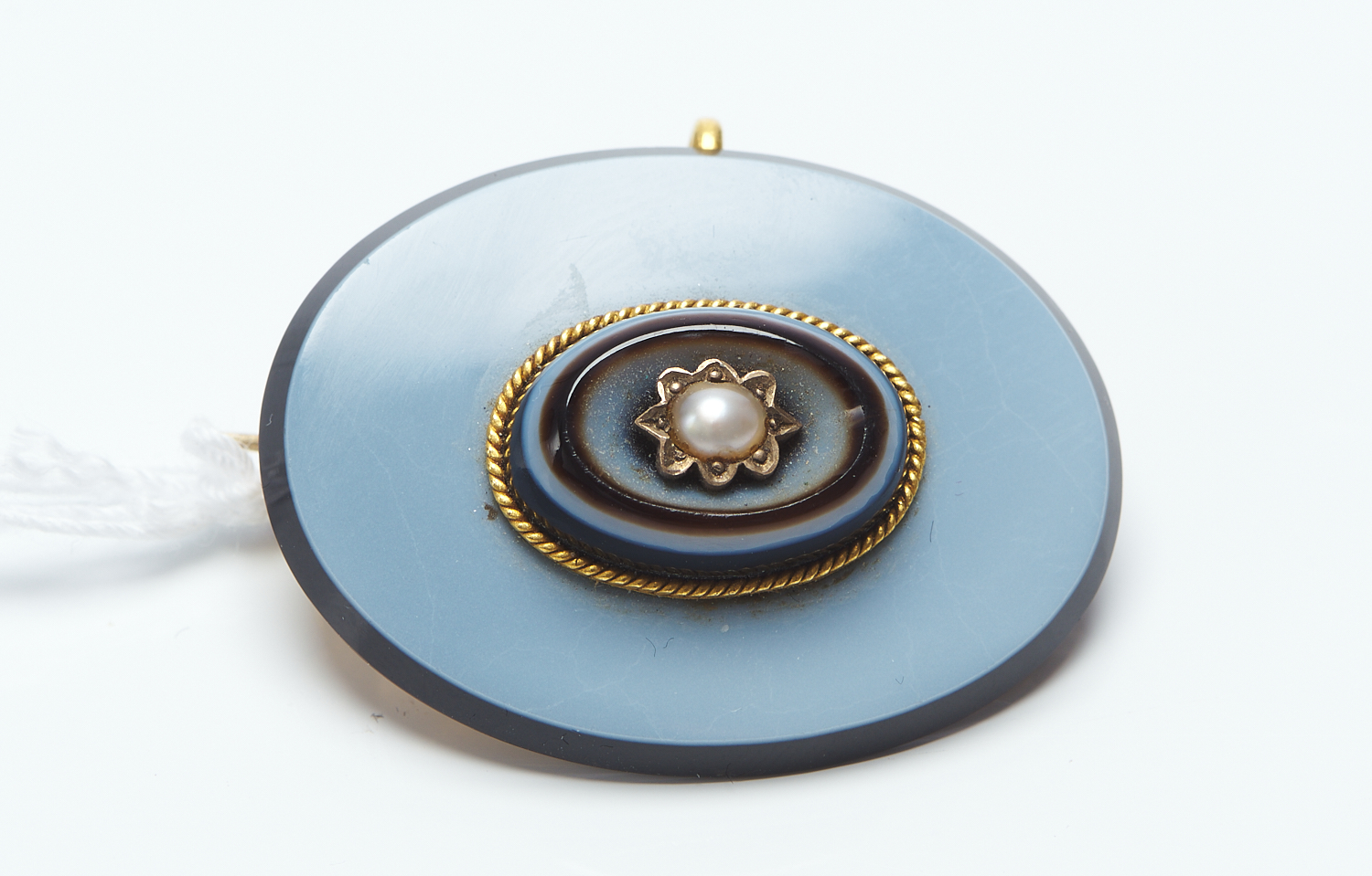 A VICTORIAN BROOCH, SET WITH A SEED PEARL AND BANDED AGATE IN 9CT GOLD, 332X26MM