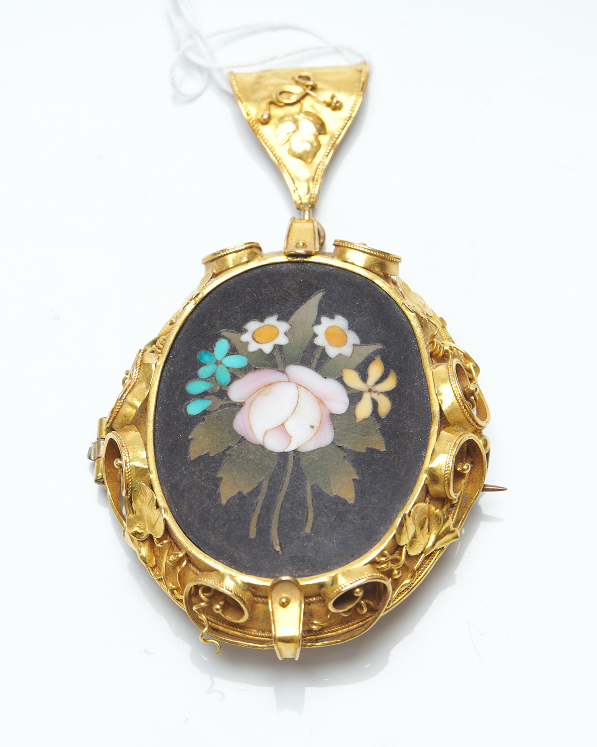 AN ANTIQUE PIETRA DURA LOCKET/BROOCH IN 15CT GOLD, OVERALL LENGTH 6.5CMS (PIN IN METAL)