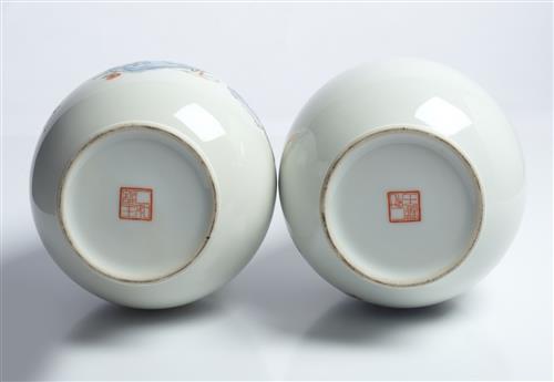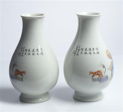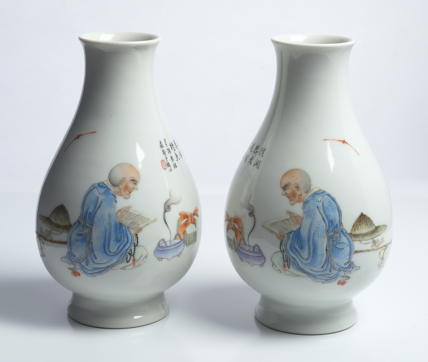 The vases decorated in mirror image with a seated monk reading from a text, bat flying overhead. Each vase inscribed with a poem and signature. Iron red seal mark to base in zhuanshu (seal script).