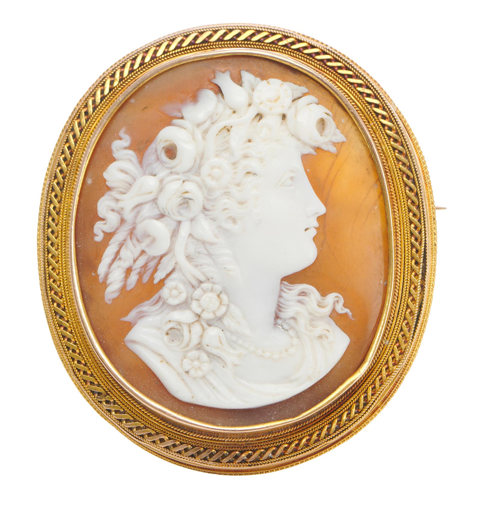 In good condition overall, no losses to shell. Shell slightly loose in frame. Small dent to frame. Replacement pin. XRF tested in 18ct gold.