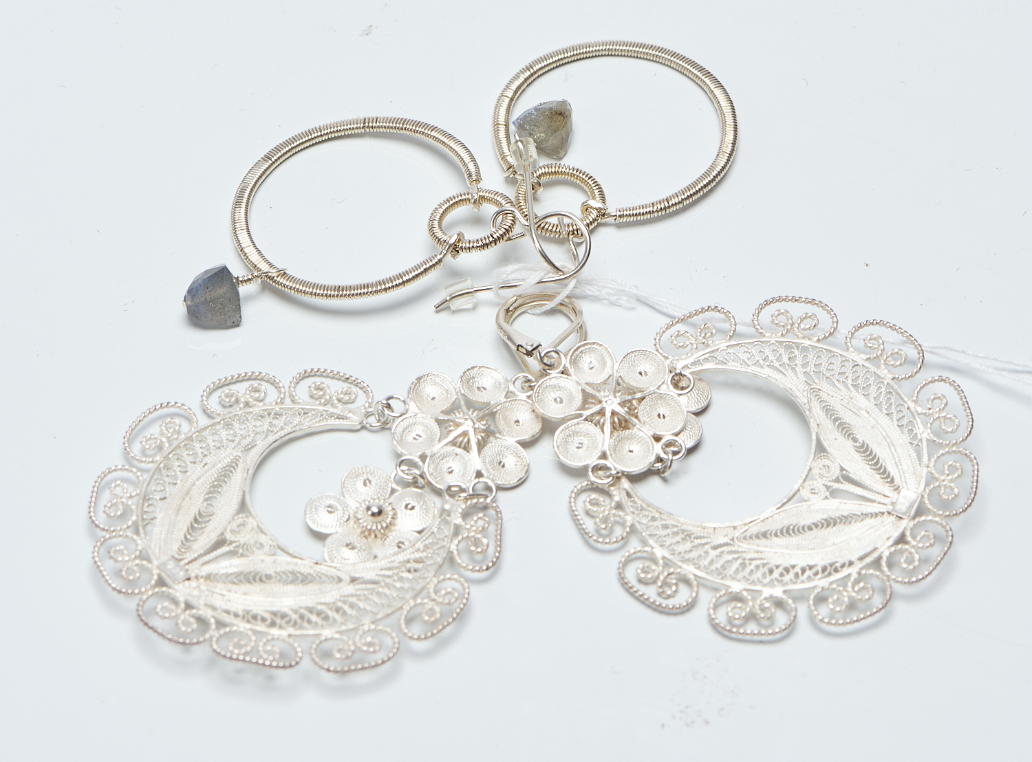 A PAIR OF FILIGREE STERLING SILVER DRESS EARRINGS TOGETHER WITH A PAIR OF STERLING SILVER HOOP EARRINGS WITH LABRADORITE DROP