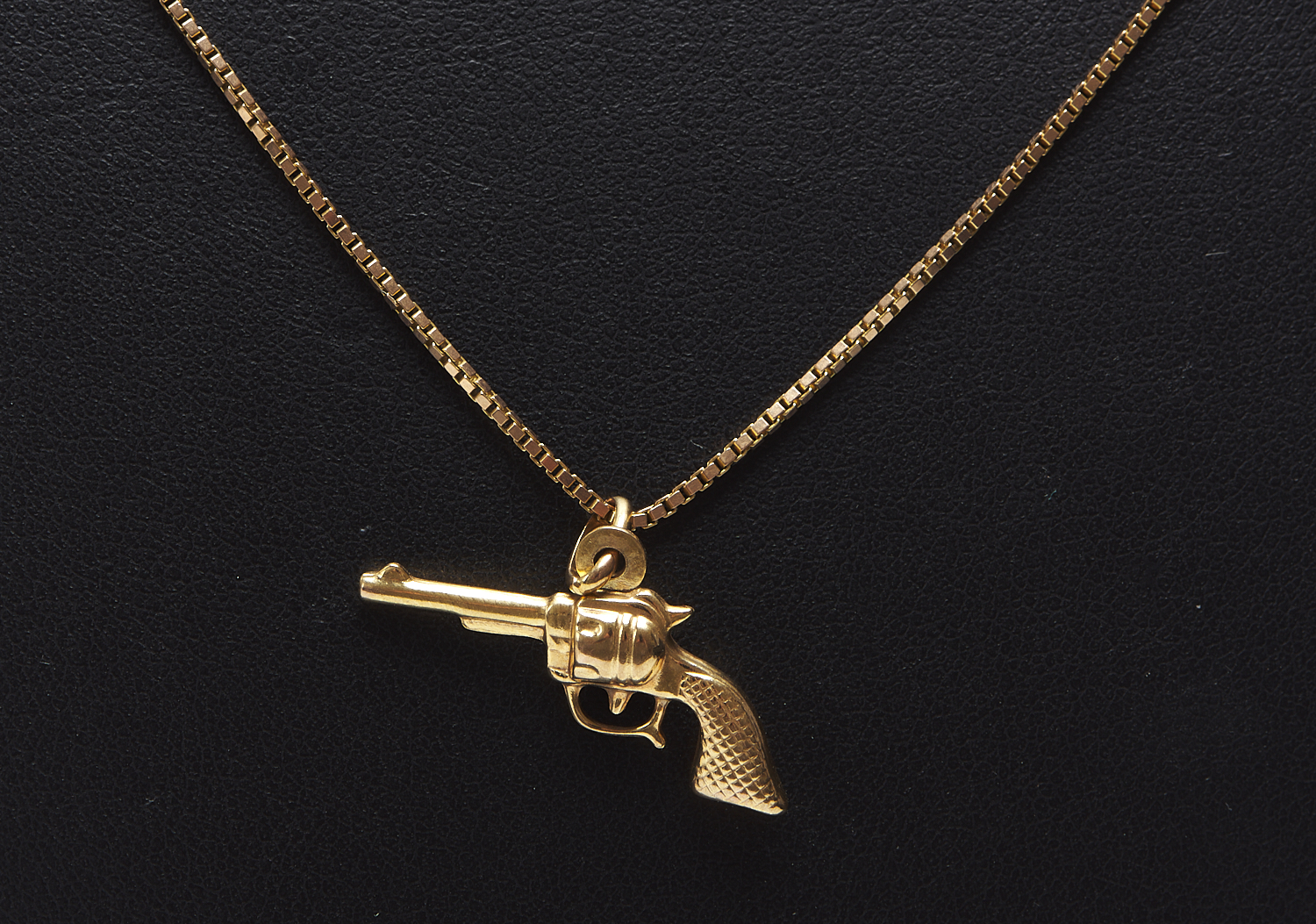 A 'GUN' PENDANT IN 9CT GOLD TO A CHAIN IN 14CT GOLD, LENGTH 61CMS, 5.8GMS