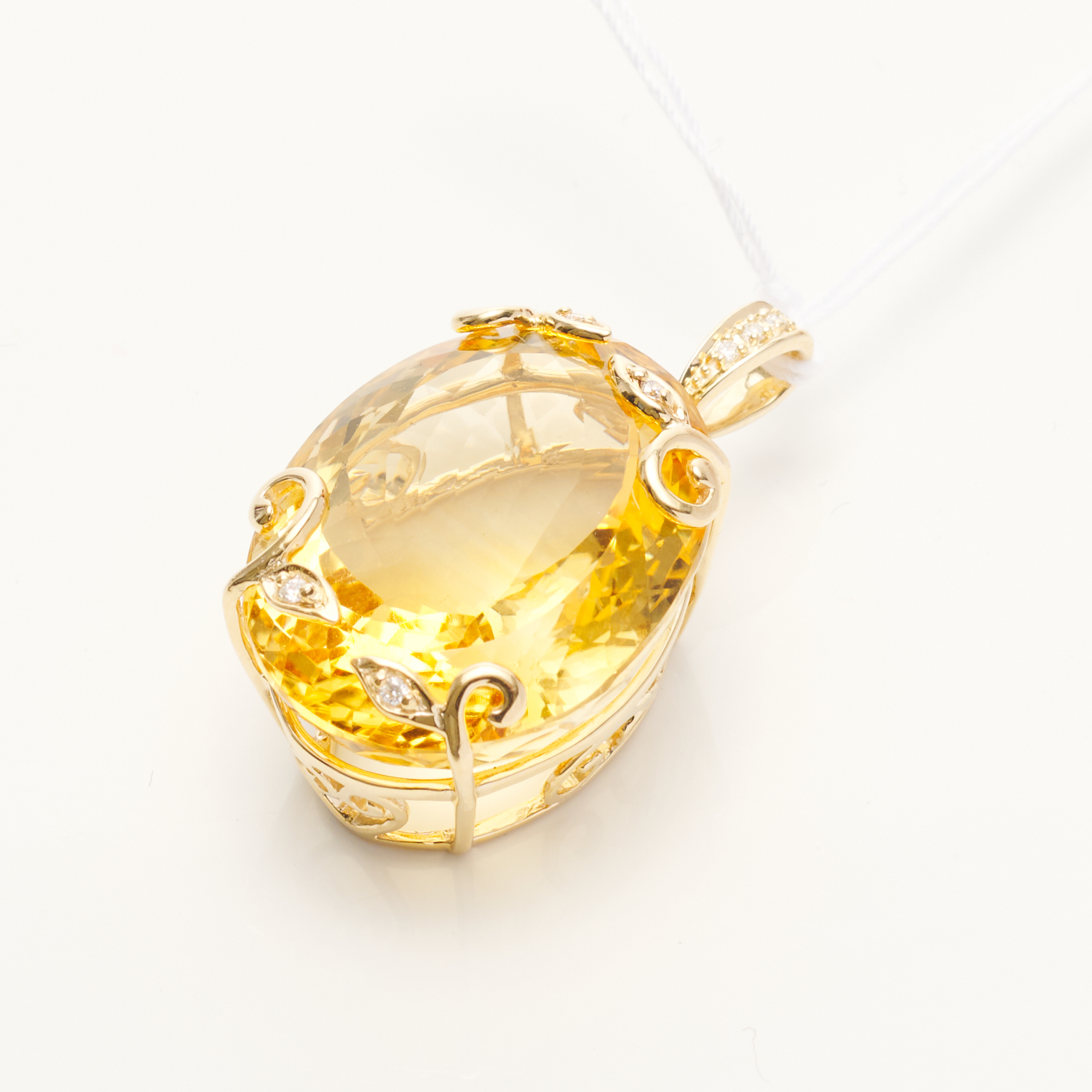 A CITRINE AND DIAMOND PENDANT IN 9CT GOLD, OF FOLIATE DESIGN, THE OVAL CUT CITRINE WEIGHING 33.89CTS, LENGTH 35MM