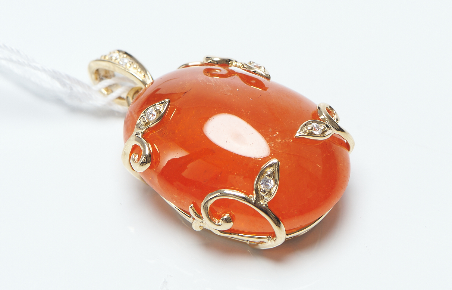 A SPESSATITE GARNET AND DIAMOND PENDANT IN 9CT GOLD, OF FOLIATE DESIGN, THE CABOCHON CUT GARNET WEIGHING 35.20CTS, LENGTH 30MM
