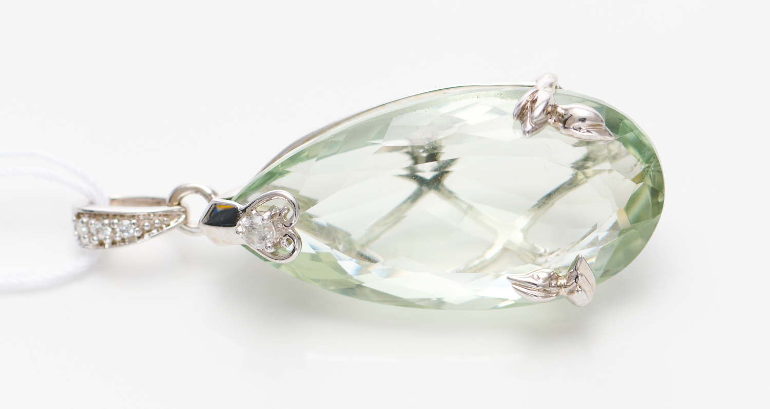 A GREEN QUARTZ AND DIAMOND PENDANT IN 9CT WHITE GOLD, OF FOLIATE DESIGN, LENGTH 34MM