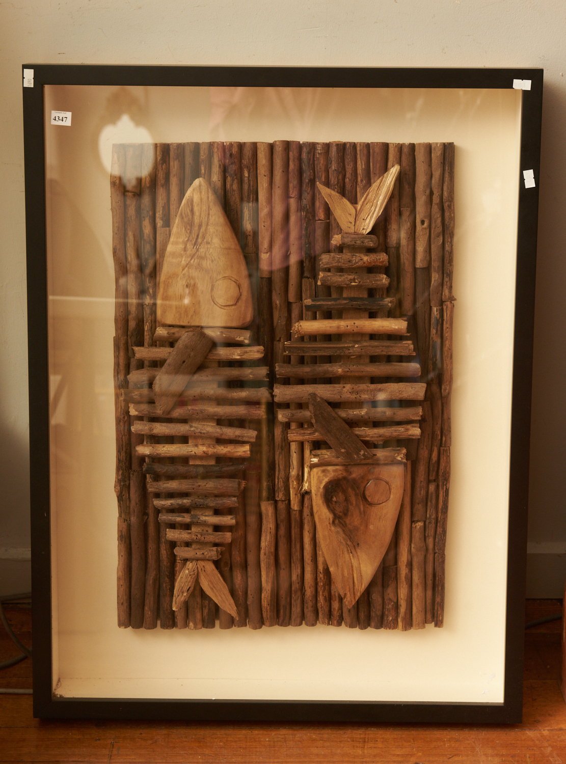 A FRAMED WOODEN ART PIECE OF TWO FISH, 88 cm H, LEONARD JOEL LOCAL DELIVERY SIZE: SMALL