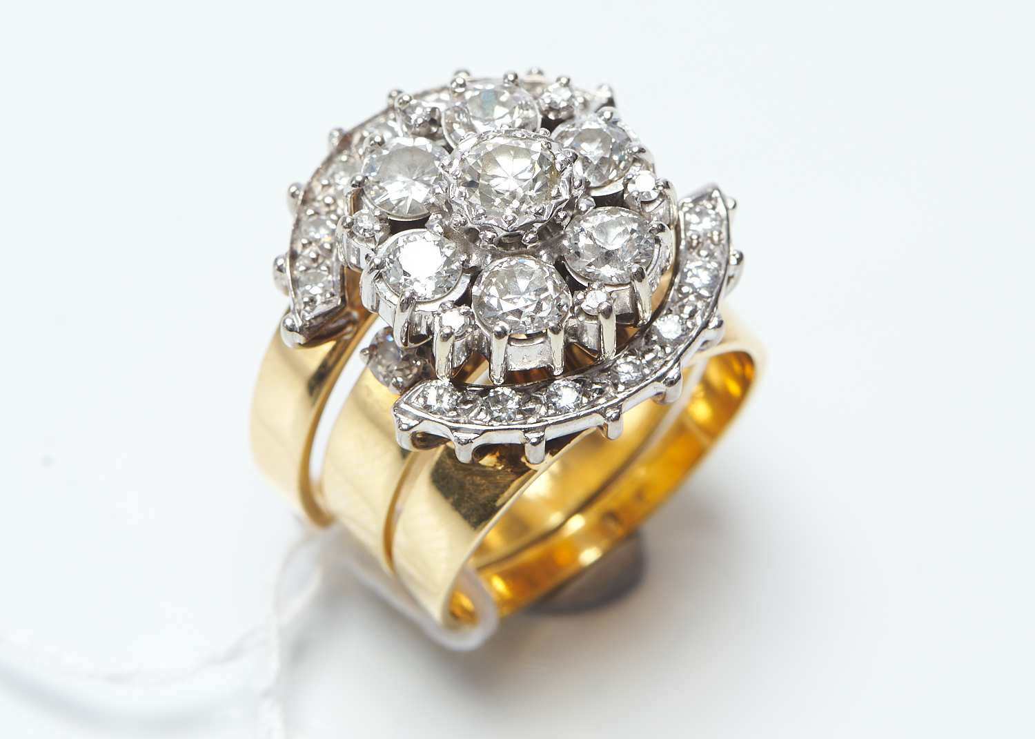 A DIAMOND RING SUITE IN 18CT GOLD AND 9CT GOLD, COMPRISING OLD EUROPEAN CUT DIAMONDS AND ROUND BRILLIANT CUT DIAMONDS, ESTIMATED 2CTS APPROXIMATELY, SIZE S, 18.6GMS