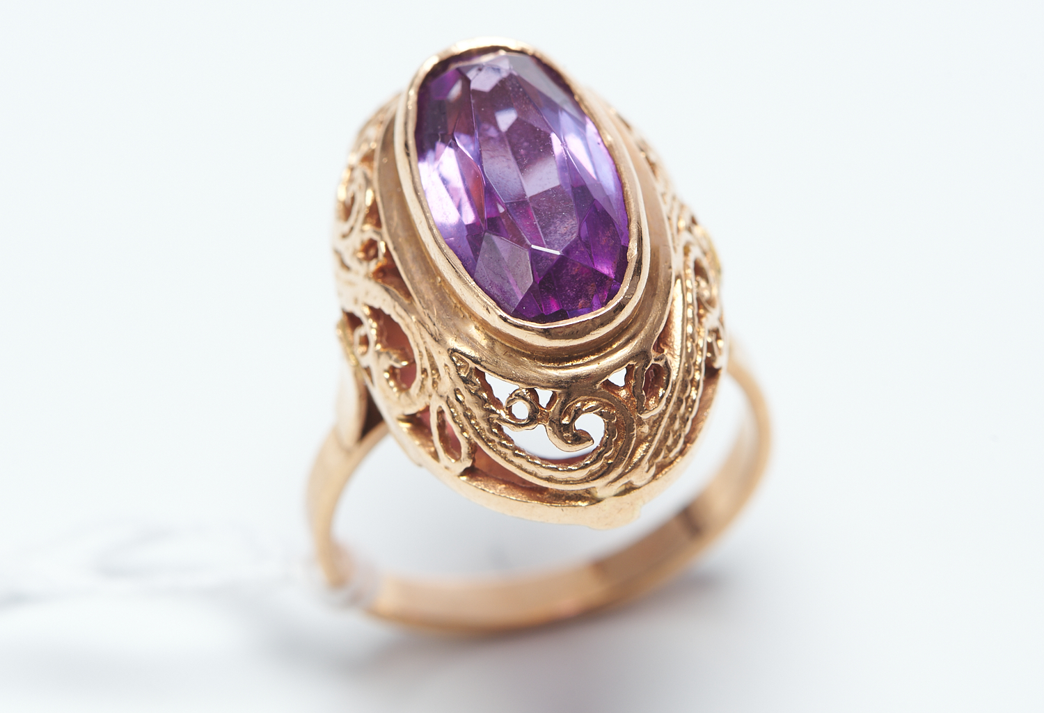 A PURPLE STONE RING IN FILIGREE SURROUND IN 14CT ROSE GOLD, SOVIET HALLMARKS, SIZE P, 7.8GMS