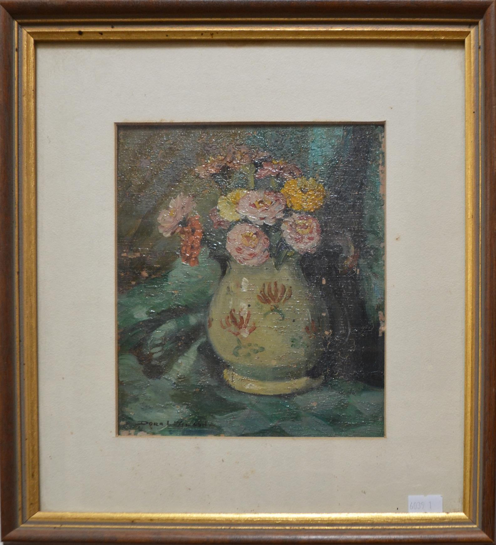 DORA WILSON, A JUG OF ZINNEAS, OIL ON BOARD, 19.5 X 17CM, CONDITION: SIGNIFICANT CRACKS AND LOSSES. LEONARD JOEL DELIVERY SIZE: SMALL