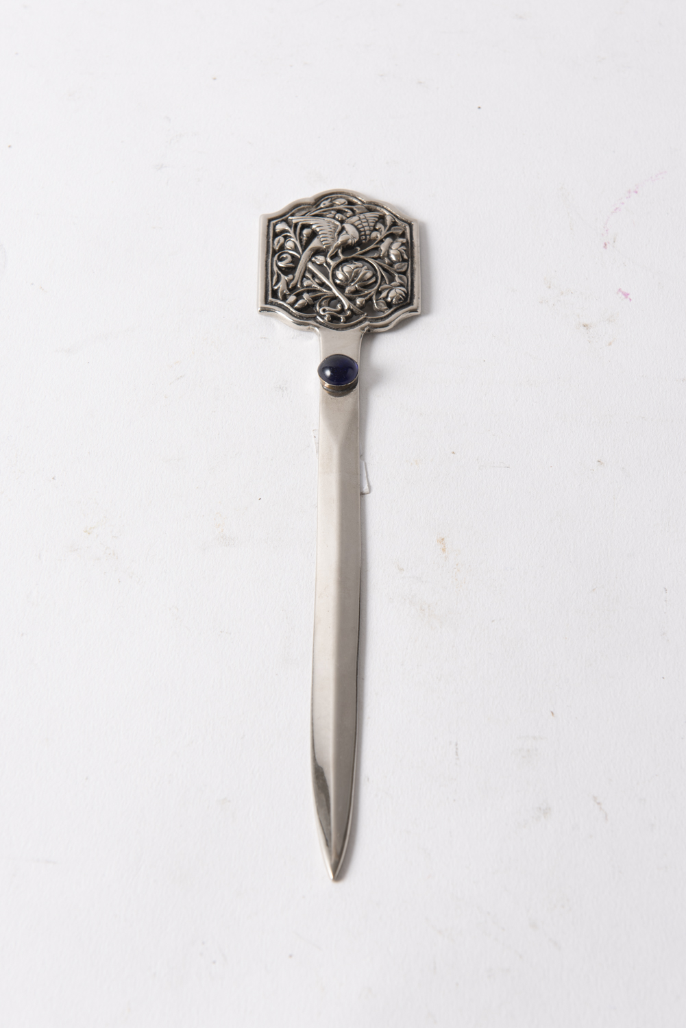 A BIRD DECORATED LETTER OPENER WITH CABOCHON BLUE STONE, LEONARD JOEL LOCAL DELIVERY SIZE: SMALL (20 CM W)