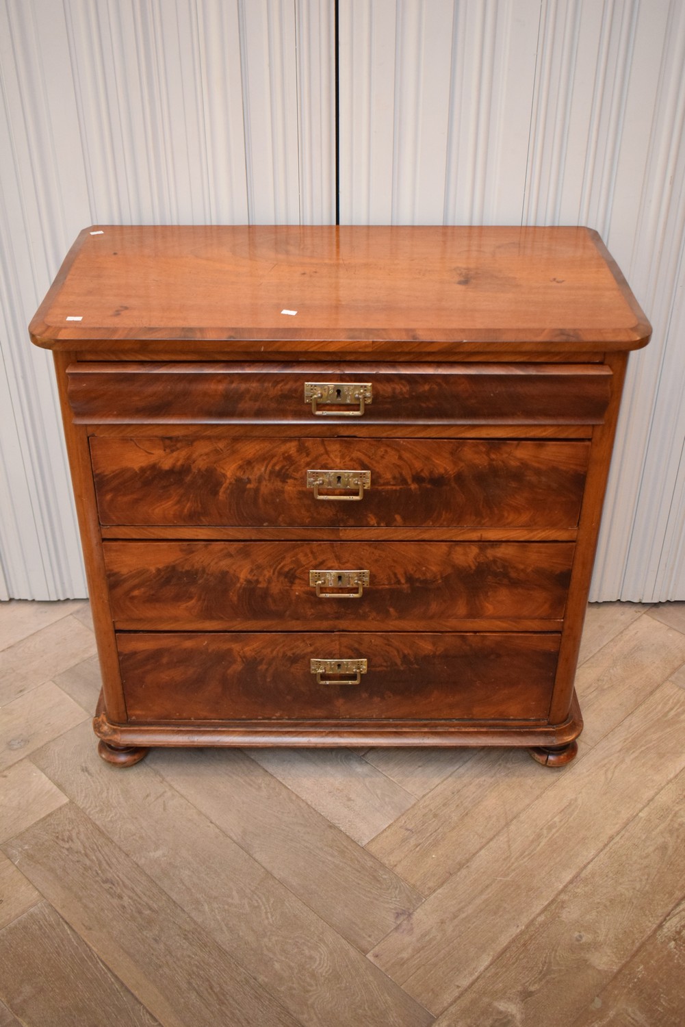 A BEIDERMEIER STYLE FLAME MAHOGANY FOUR DRAWER CHEST WITH BRASS HANDLES, CIRCA 1890 ( 91H X 92W X 46D CM) (PLEASE NOTE THIS HEAVY ITEM MUST BE REMOVED BY CARRIERS AT THE CUSTOMER'S EXPENSE. LEONARD JOEL STAFF CANNOT ASSIST CARRYING THIS ITEM) (X-LARGE ITEM)
